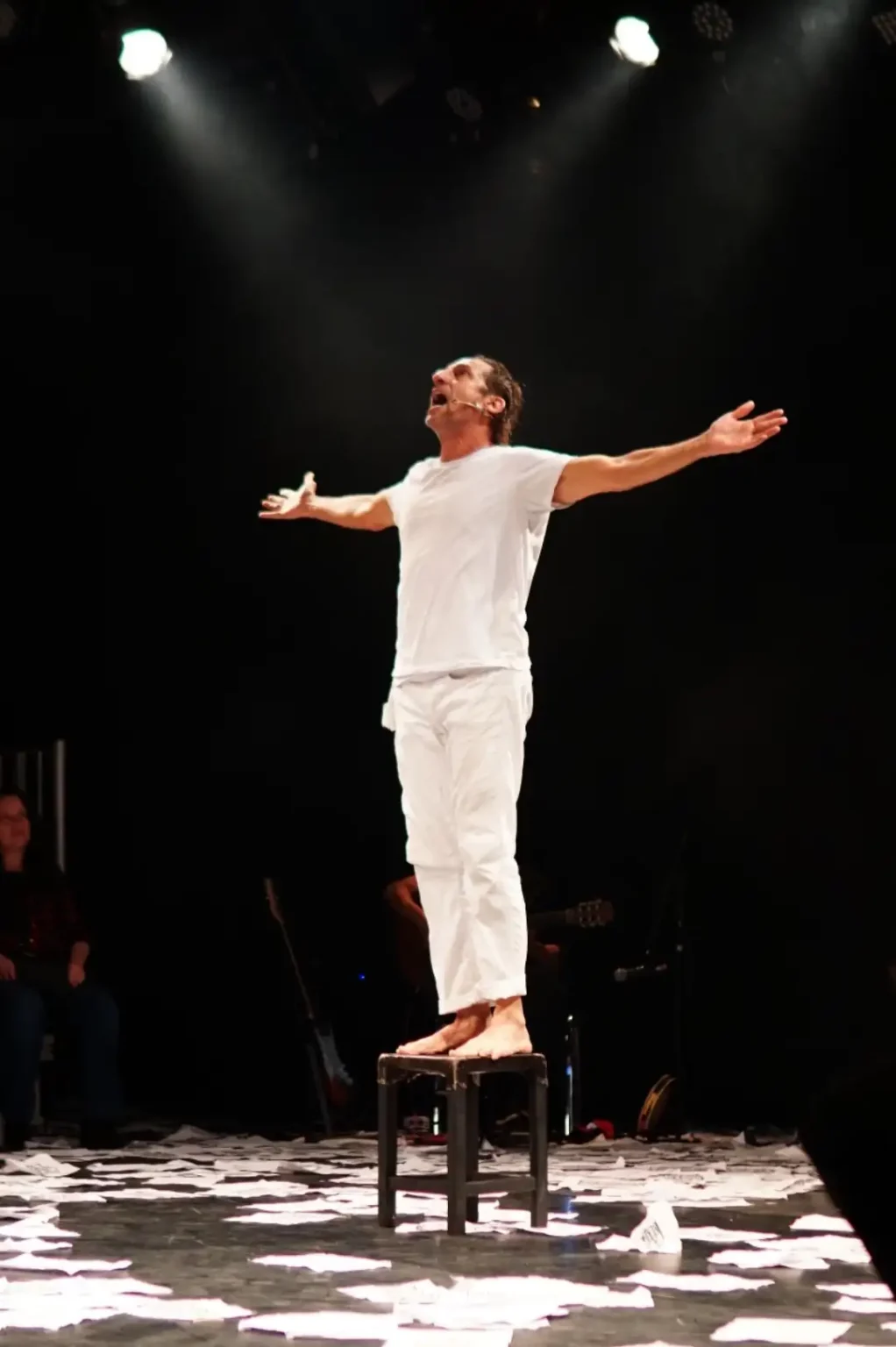 A cenografia também é simples. O palco está repleto de papel com poesias de Torquato, e há um banco que Tuca utiliza para se sentar.