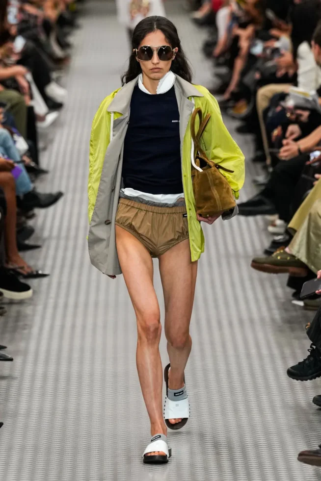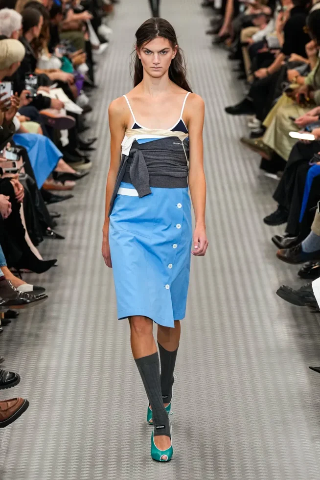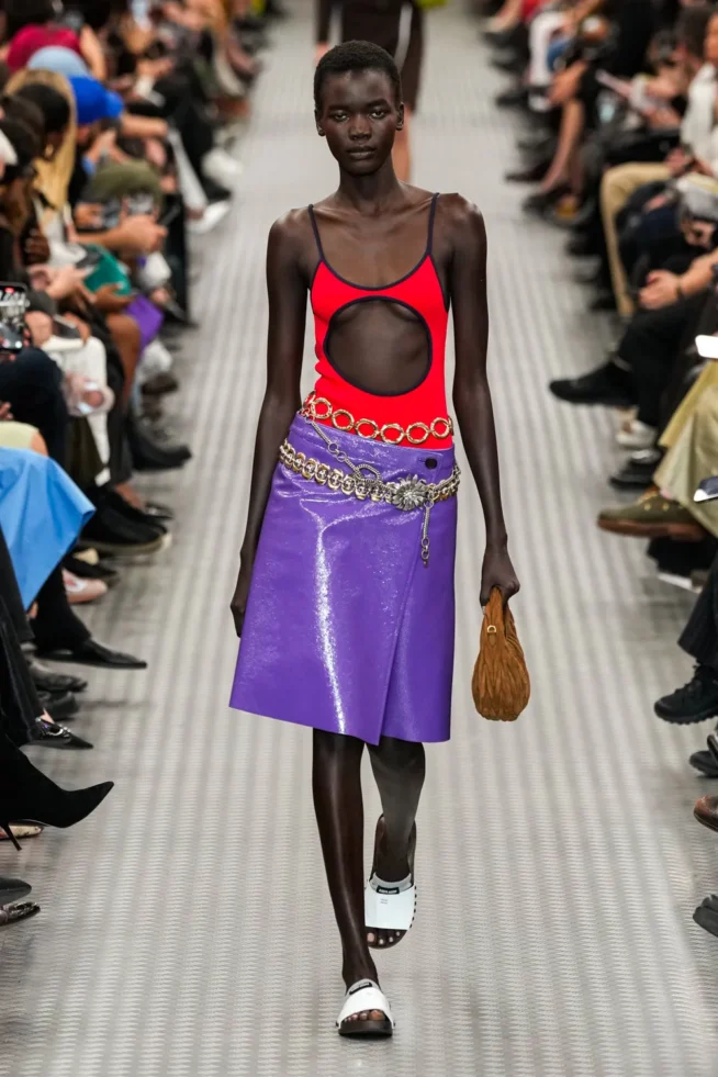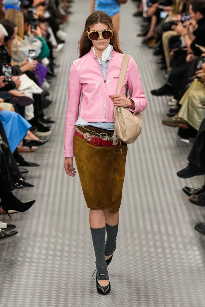 O underwear reaparece em versão mais volumosa, um balonêzinho de leve; os plissados também, mais largos. A Miu Miu está menos college e voltou às suas origens, bem mais excêntrica e experimental: maiôs usados com saias clássicas, cinto de metal retrô, óculos dos anos 1960, lingerie, bordados com cara vintage, agasalho emprestado do armário do pai (ou seria do namorado?), recortes, muita pele à mostra. A sobreposição de peças com mix de cores e texturas!  Será que a marca sugere a MODA CIRCULAR?