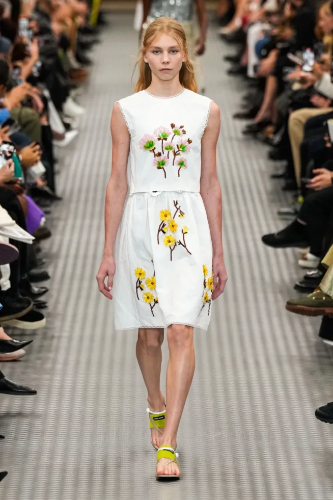 Os códigos clássicos da etiqueta estavam presentes: as saias na altura do joelho, os bordados, os sapatos esquisitões, as estampas geométricas, a transparência suave e a pele à mostra já estavam presentes naquele primeiro desfile da marca. Há novidades também: os maiôs ultra recortados combinados a saias envelope, os cintos e colares de correntes usados de forma displicente criando descontração no estilo.