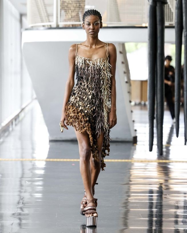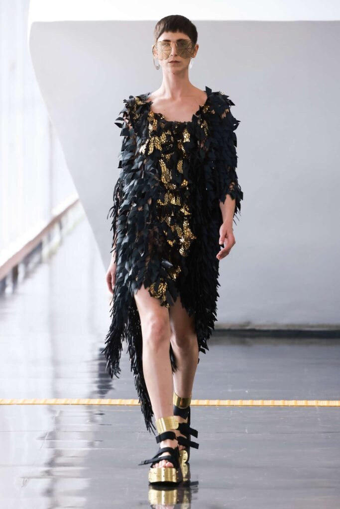 As peças são bordadas com paetês feitos a partir de resíduos têxteis em vários formatos. Além de cristais Swarovski e metais e joias de Carlos Penna, em vestidos curtos e médios com pontas assimétricas e finalizados com saltos tipo plataforma ou paletes criadas a partir de peças da Rider. A novidade são os pedaços de couro cortados laser, que dá forma a estruturas armadas usadas nos ombros.