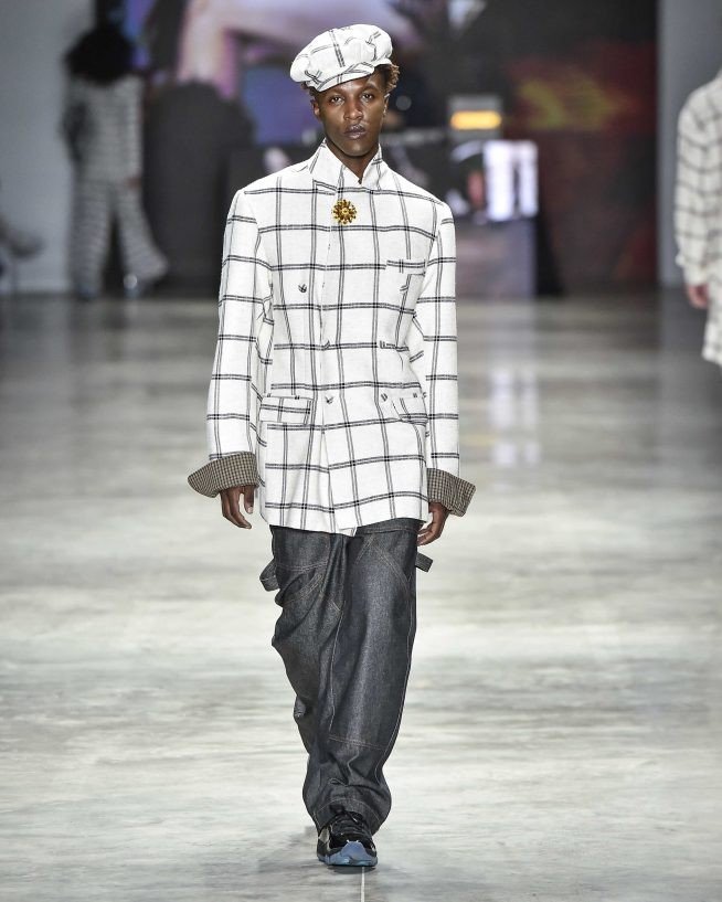Os designers Hisan Silva e Pedro Batalha trabalham com as padronagens clássicas de alfaiataria para criar suas silhuetas de streetwear, de volumes pontuais, sobreposições e cumprimentos curtos, inspirados nos bailes black dos anos 1970 e 80. O Ateliê Masanga assina os acessórios feitos à mão, como bolsas artesanais de miçangas.