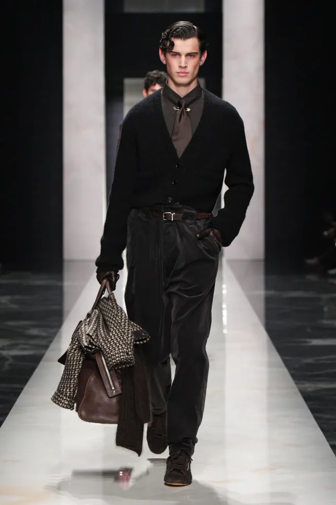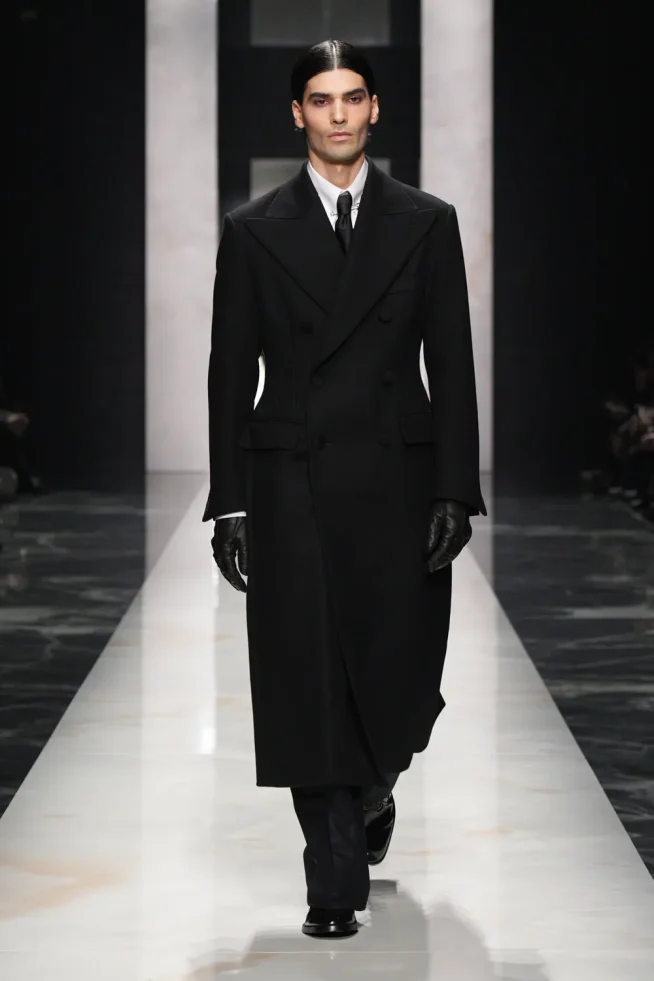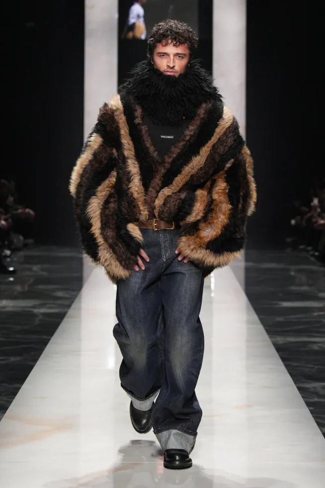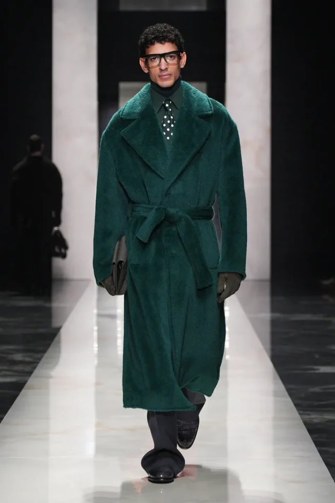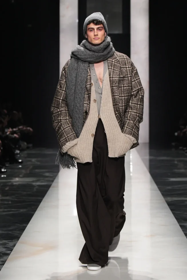 O desfile focou em “autenticidade” e “individualidade” para sua coleção Outono/Inverno 2026-2027, apresentando estilos distintos e românticos. “retratos de um homem”, incluindo o “pensador” (calças largas de veludo cotelê/lã), o “criativo visionário” (gravata de poá com terno listrado), o “romântico atormentado” (flores no lenço de bolso/cachecol) e o “mediterrâneo sensual” (robe com estampa de pantera/camisa aberta com terno de veludo). A marca chamou os looks de um “convite para ir além da homogeneização”. Um elemento unificador foi manter-se aquecido em peles (falsas) XXL.