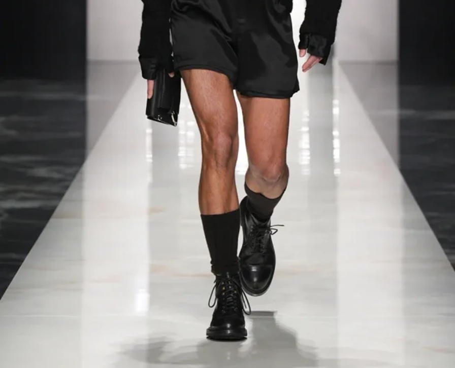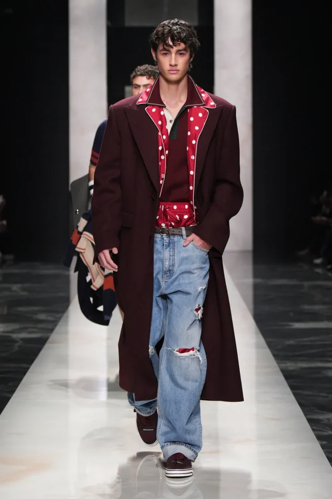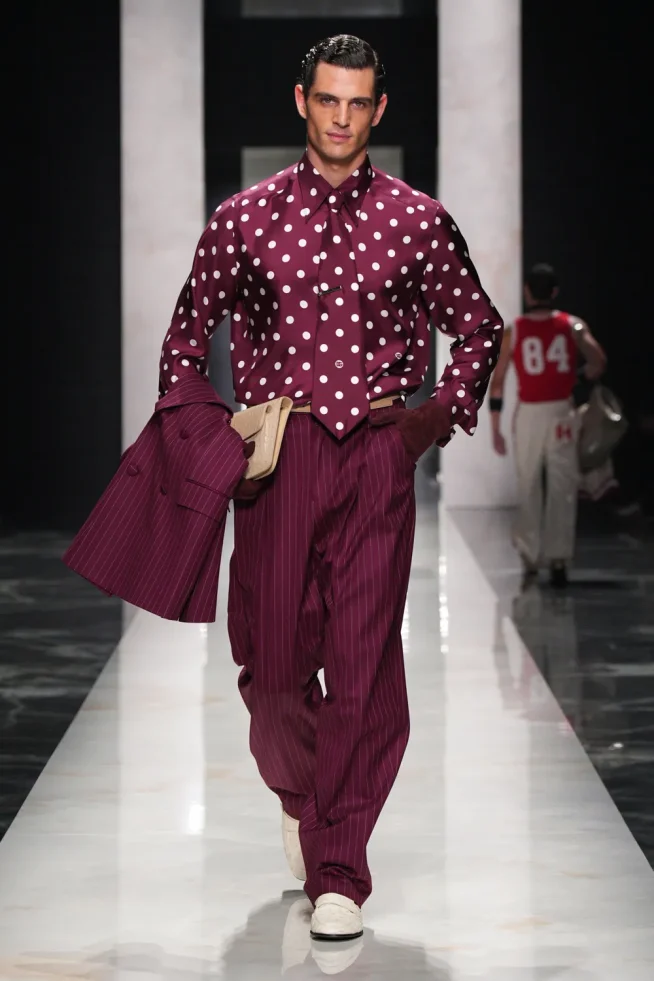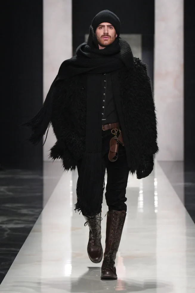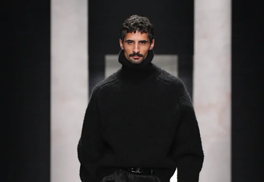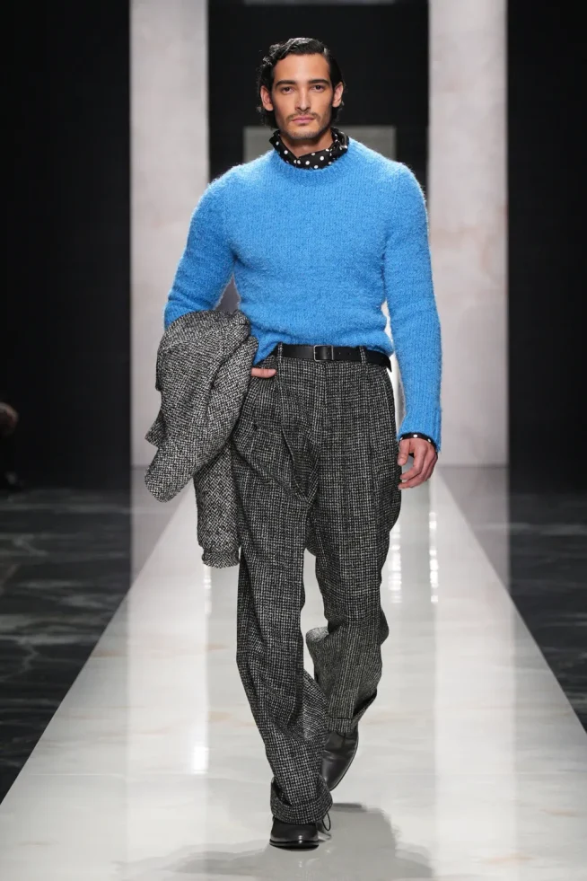 O desfile focou em “autenticidade” e “individualidade” para sua coleção Outono/Inverno 2026-2027, apresentando estilos distintos e românticos. “retratos de um homem”, incluindo o “pensador” (calças largas de veludo cotelê/lã), o “criativo visionário” (gravata de poá com terno listrado), o “romântico atormentado” (flores no lenço de bolso/cachecol) e o “mediterrâneo sensual” (robe com estampa de pantera/camisa aberta com terno de veludo). A marca chamou os looks de um “convite para ir além da homogeneização”. Um elemento unificador foi manter-se aquecido em peles (falsas) XXL.