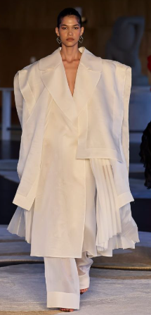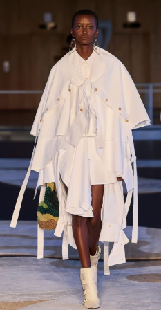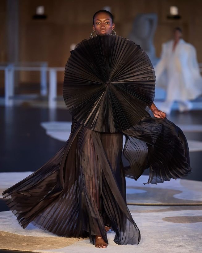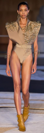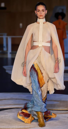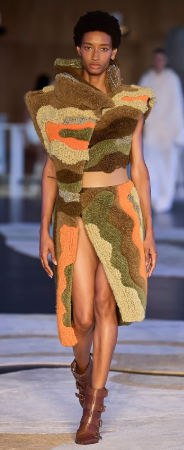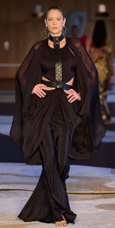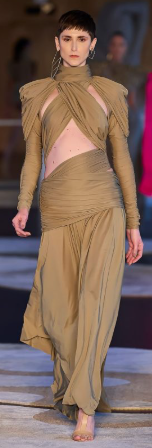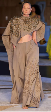 Modelagem estruturada com formas geométricas, textura em relevo idealizando raízes, e cores nos tons terrosos e neutros. A utilização de materiais artesanais traz bordados e aplicações. Os looks em camadas recriam a experiência de caminhar por Inhotim. É como se a natureza desligasse o visitante do mundo exterior e o acolhesse em seu próprio tempo. O interior de cada espaço convida à pausa e à reflexão, levando a um mergulho sensível que nos reconecta com diferentes camadas de nós mesmos.