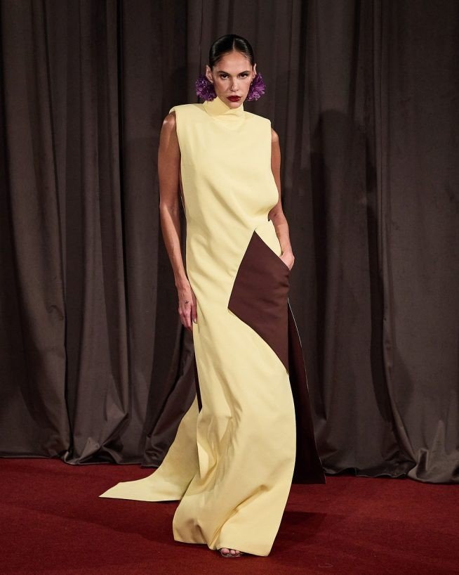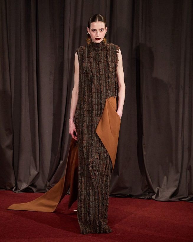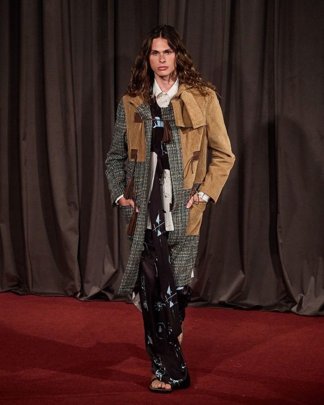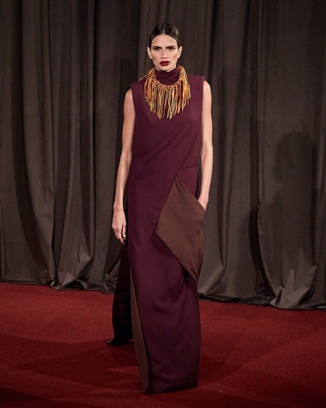 O patchwork de referências culturais calcadas no nordeste brasileiro, entra a arquitetura minimalista elegante, com foco em materiais naturais de Isay Weinfeld, que assina a coleção com Airon. A modelagem ganha formas em momentos mais recortadas, em outros mais arredondadas. As peças se encaixam no formato e nas cores como no  casaco longo azul com toques de marrom e vinho, feito de retalhos desfiados, ou no decote milimetricamente retangular nas costas do vestido marrom arroxeado que abre o desfile.