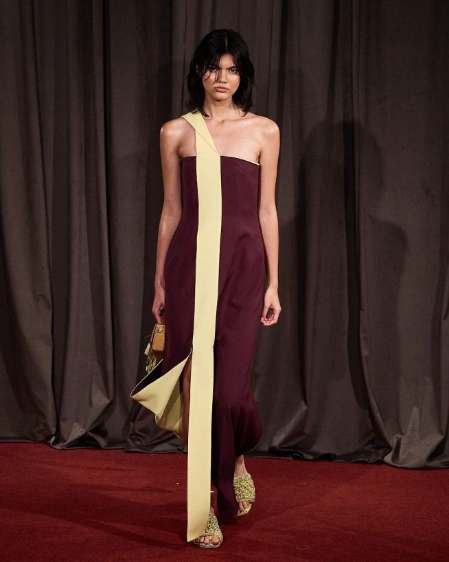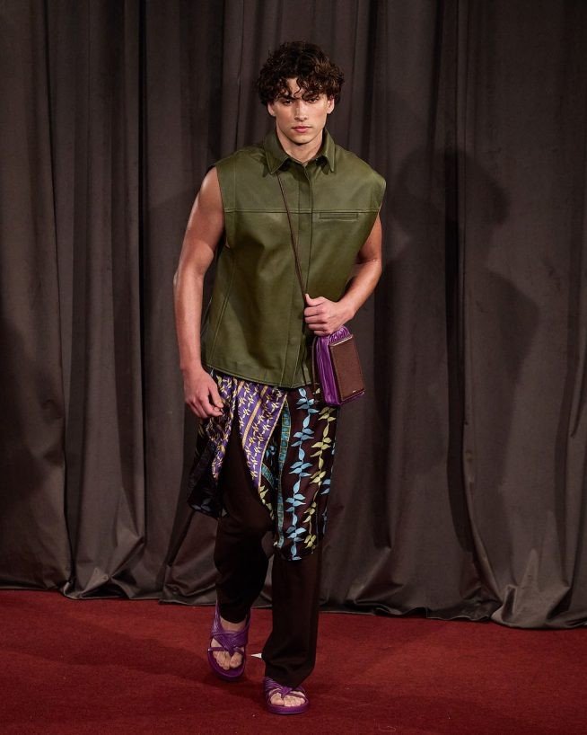 O couro plissado em jaquetas e bolsas de tamanhos diferentes e tons como o verde abacate, ou combinações sofisticadas de vinho e amarelo. A cartela de cores impecável apresentada no desfile da Misci. 0 styling de Renata Correa, foi um dos pontos altíssimos da coleção, que traz o mix do amarelo manteiga na calça masculina com o blazer marrom quase berinjela, puxando para o roxo, que aparece pela primeira vez na marca. Os tons terrosos muito sofisticados, são combinados com violetas, verdes, azuis e vermelho.