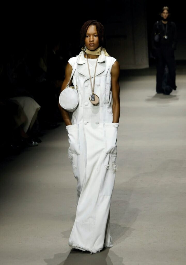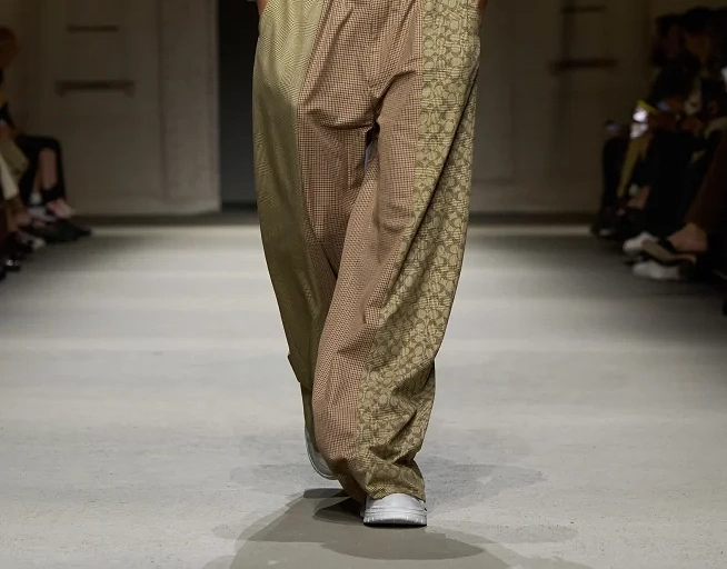 O diretor criativo Stuart Verves mais uma vez reafirma sua predileção por inverter as proporções e brincar com o foco. Calças em patchwork de padronagens, volumosas, quase clochard, que traduzem o princípio baggy do jeans para a alfaiataria. A silhueta da Gen Z parece ter se consolidado, ainda que muitos ainda se agarrem a cortes mais secos e rentes ao corpo.