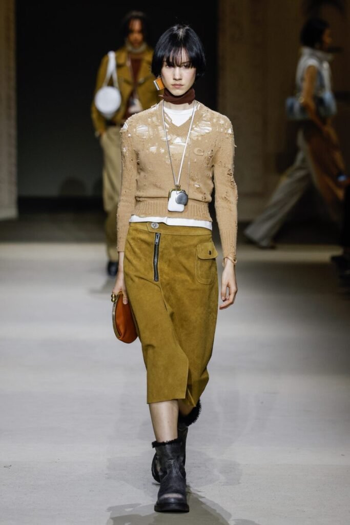 Na composição dos acessórios, a Coach valorizou o passado enquanto fala do presente. Bolsa Tabby aparece em versão clutch, as bolsas de pescoço com fecho Kisslock acompanharam brincos e colares que remetem a amuletos vitorianos: relicários em forma de coração, mini envelopes, pequenas moedas e até livros articulados, todos com bilhetes de amor gravados. Detalhes que pareciam pedir uma leitura mais íntima da coleção, quase como segredos guardados contra o ritmo acelerado da cidade.
