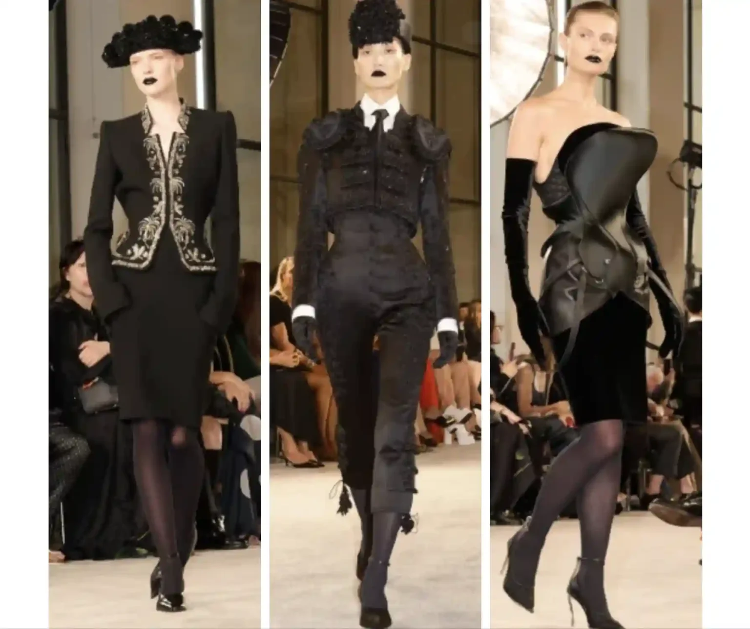 A coleção apresentou vestidos coluna com construção rígida, casacos em lã encorpada, corsets de aparência metálica, alfaiataria com ombros destacados e peças em veludo, couro moldado, moiré e tule bordado. Algumas criações trouxeram elementos esculturais aplicados diretamente sobre o corpo, como volumes geométricos, estruturas espirais e acessórios que funcionam como prolongamentos do vestido.