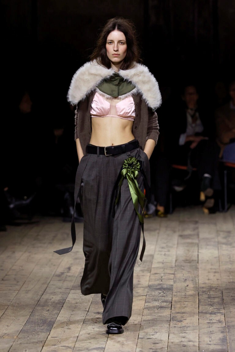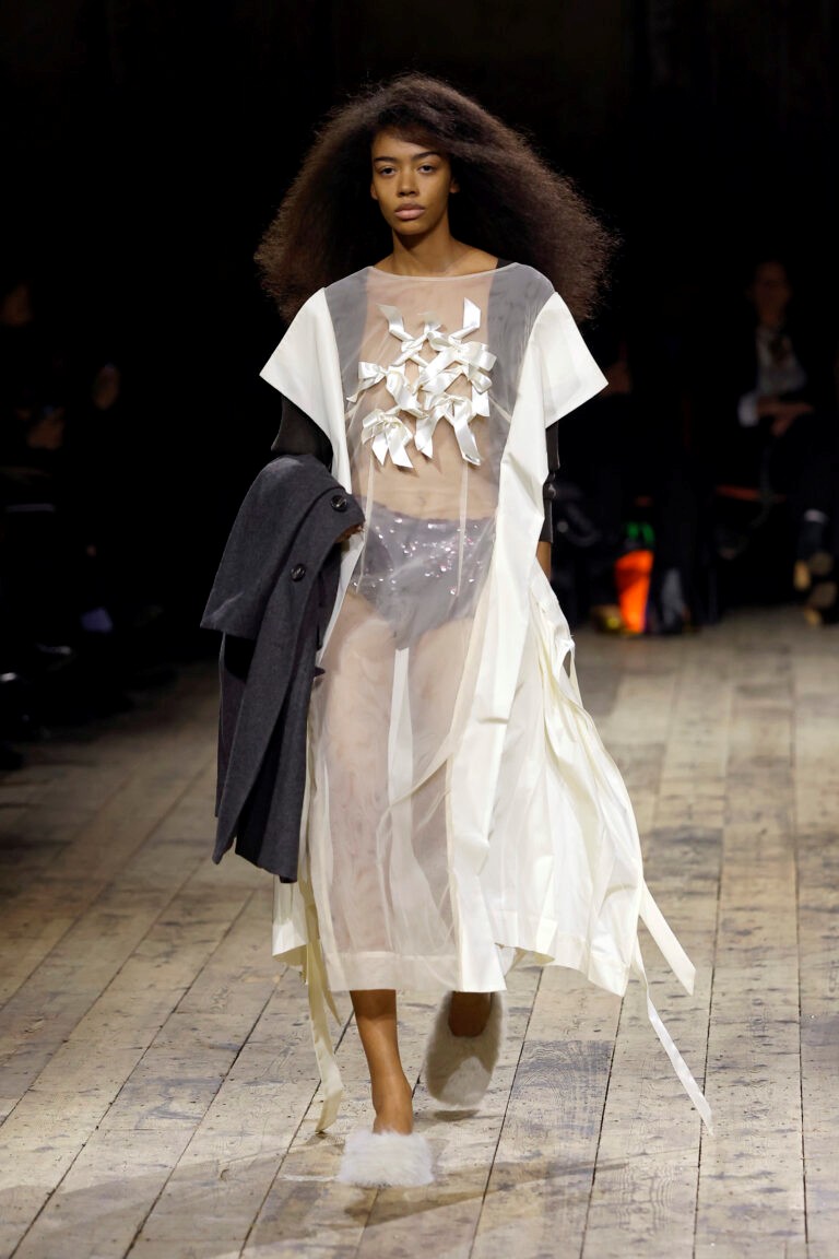 A desconstrução de símbolos da ultrafeminilidade foi a narrativa da designer Simone Rocha para a nova coleção de inverno 2026. Nesta estação, as peças-desejo — rendas, laços, babados e frufrus — vêm acompanhadas de jaquetas bomber e meias de futebol que cobrem toda a canela. Há momentos essencialmente românticos, como os vestidos finais com volumes acentuados no quadril e amarrações que remetem a corsets. No entanto, é quando ela funde a estética crua das fotografias de Perry ao seu universo etéreo que a coleção ganha ainda mais força.