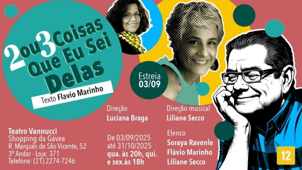 Após mais de 30 anos dedicados a escrever, dirigir e pensar o teatro por trás das cortinas, Flávio Marinho decidiu atravessar a ribalta e se colocar no centro da cena. “2 ou 3 Coisas Que Eu Sei Delas”, em cartaz desde 3 de setembro no Teatro Vannucci, no Rio de Janeiro é um espetáculo teatral dirigido por Luciana Braga que marca a primeira experiência de Marinho como ator e se constrói como um encontro afetuoso entre memórias, música e humor.
