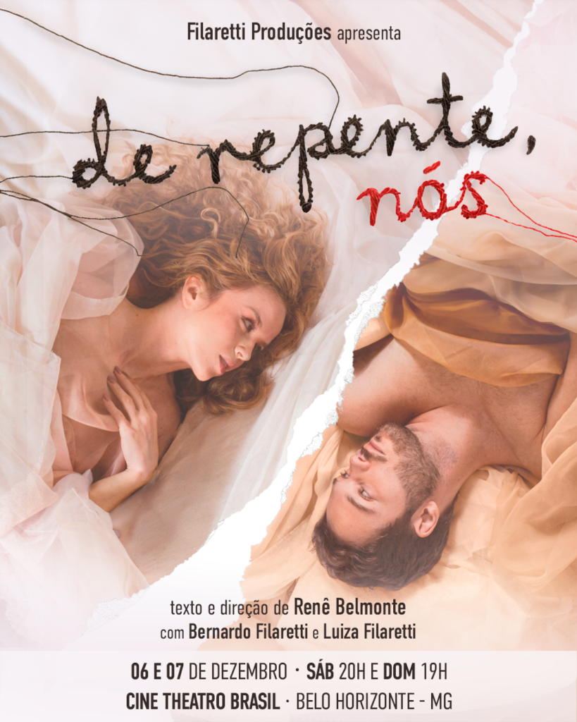 Há encontros que parecem obra do acaso — e outros que parecem preparados para revelar tudo o que a gente precisa ouvir, sentir ou enfrentar. Esse é o ponto de partida da peça “De repente, nós”, que estreia em Belo Horizonte nos dias 6 e 7 de dezembro, no palco do histórico Cine Theatro Brasil, trazendo o casal de atores Bernardo Filaretti e Luiza Filaretti, contracenando juntos pela primeira vez. O texto e a direção são de Renê Belmonte, nome renomado do cinema/audiovisual e agora presente também no teatro.