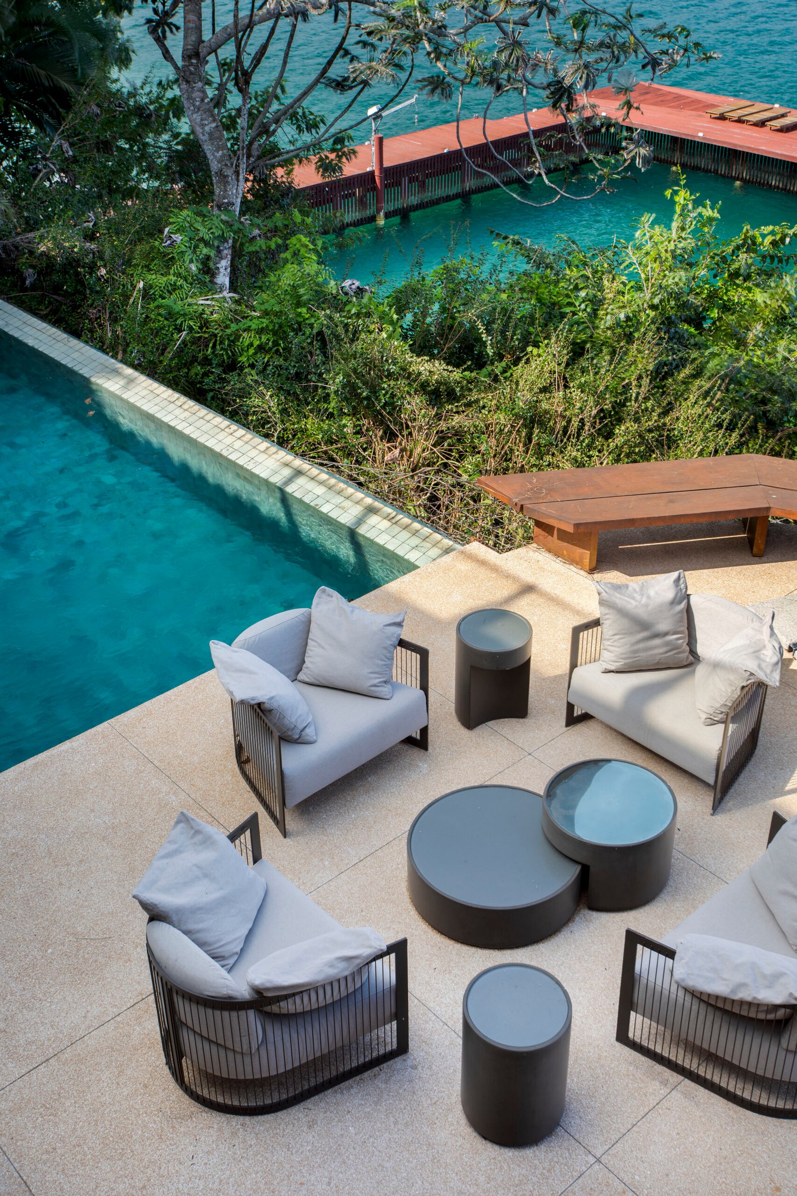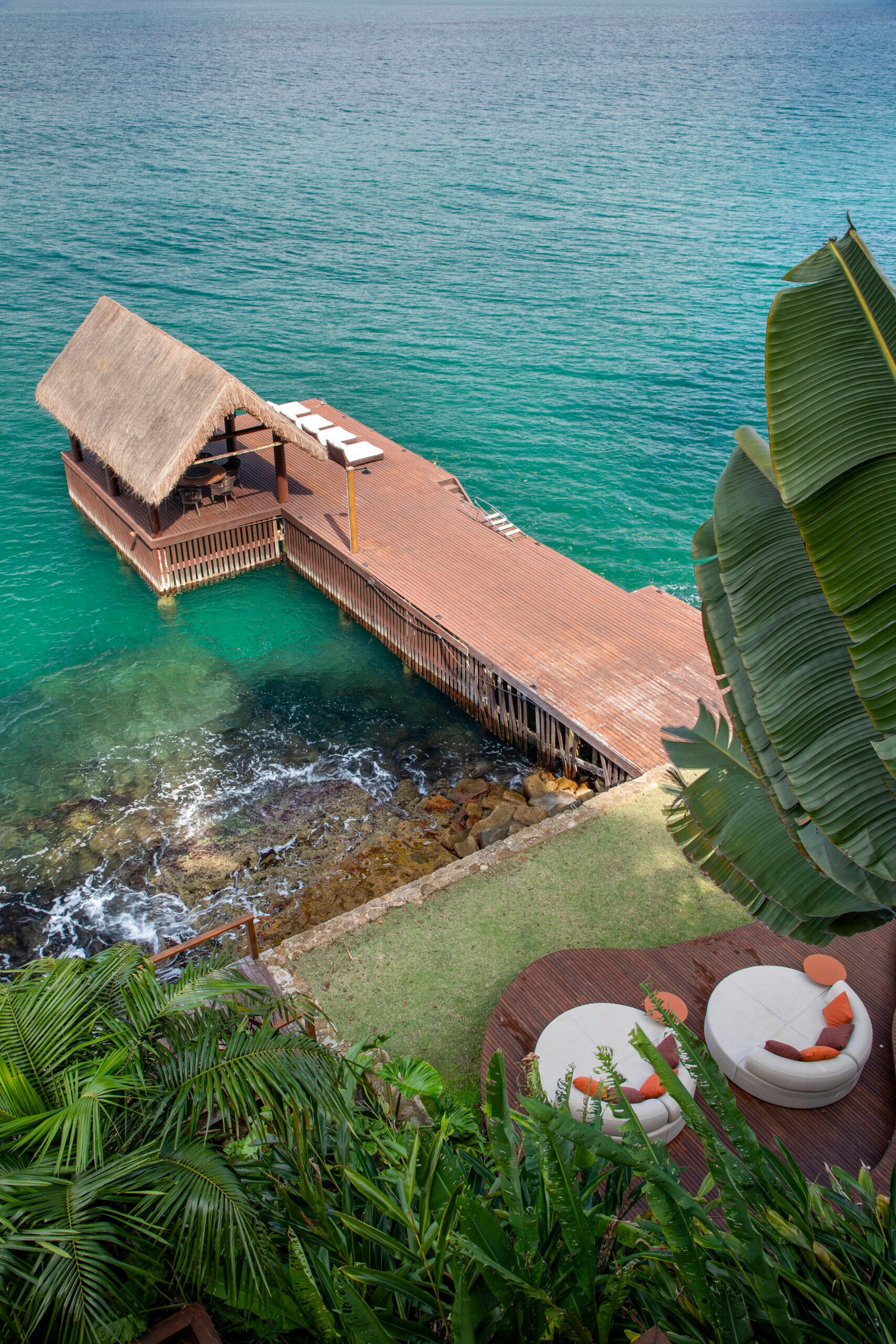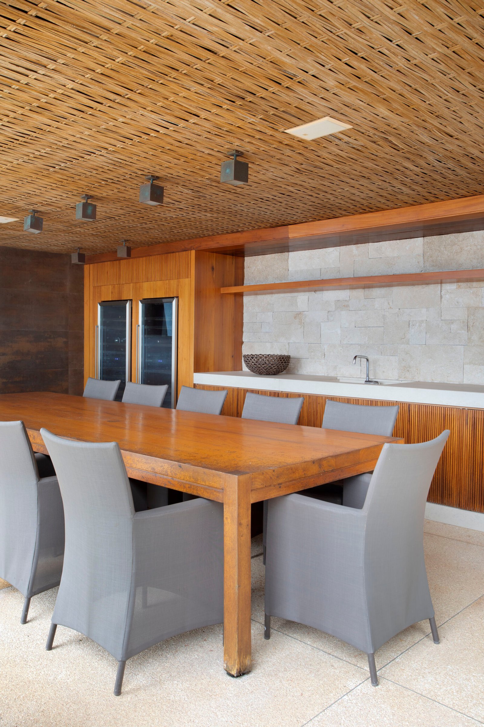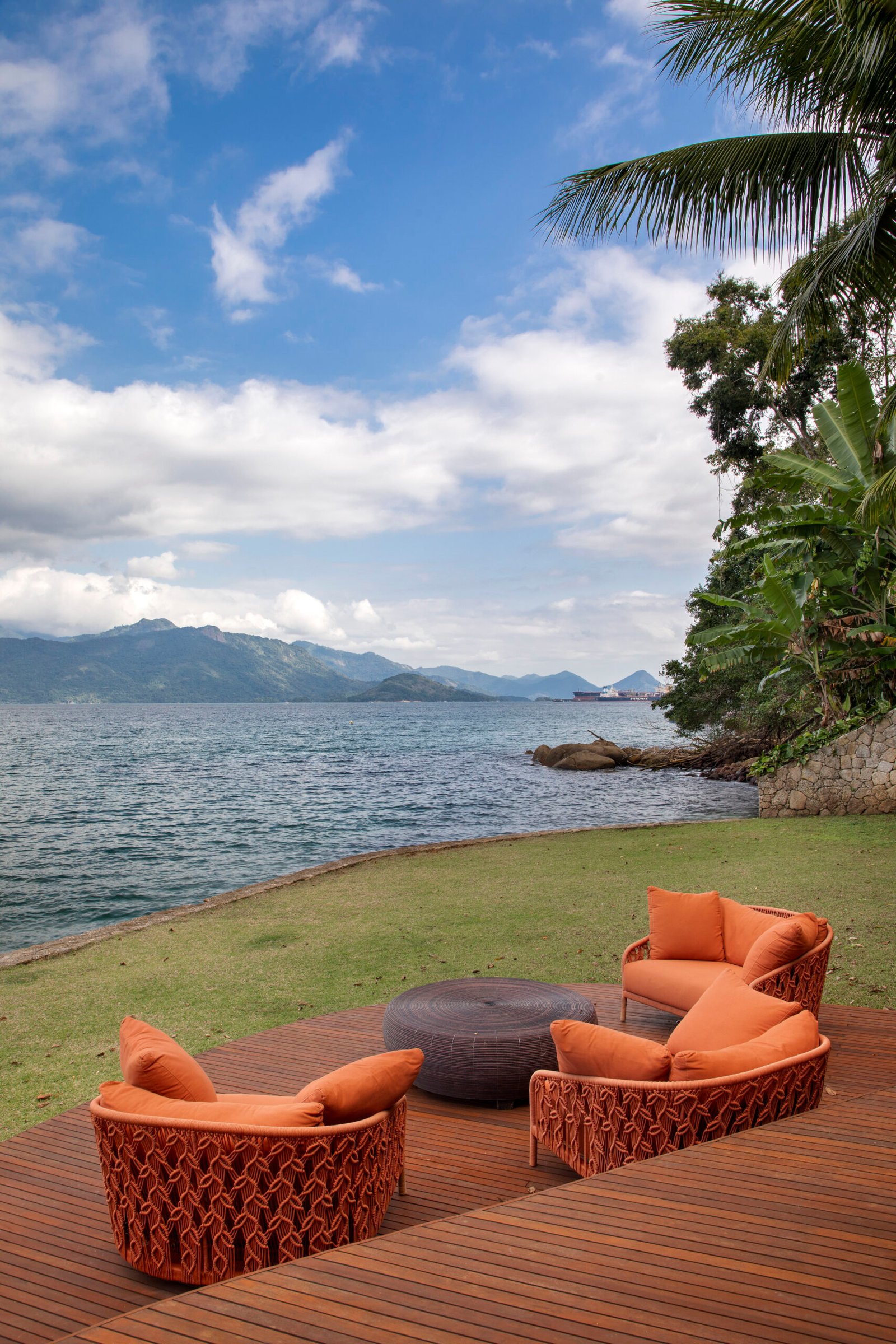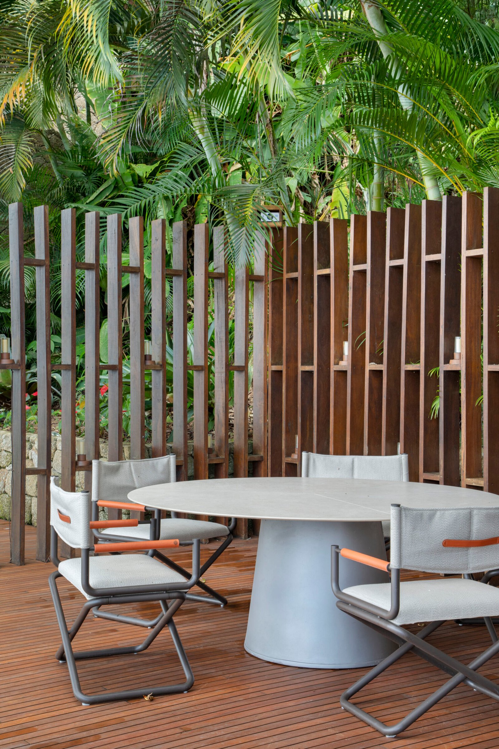 Paralelamente à atualização da casa principal, Mônica Gervásio projetou do zero um anexo de lazer à beira-mar, que se tornou o novo coração social da propriedade. Pensado como um lounge gourmet para o pós-praia e para encontros maiores, o espaço funciona como uma extensão natural da residência. Leve, despretensioso e profundamente integrado ao entorno, o projeto adota uma estrutura modular, suspensa e desmontável, construída exclusivamente com materiais naturais e ecológicos. Decks em desnível, formas orgânicas e móveis arredondados criam diferentes pontos de contemplação, celebrando a proximidade com o mar e o ritmo das marés.