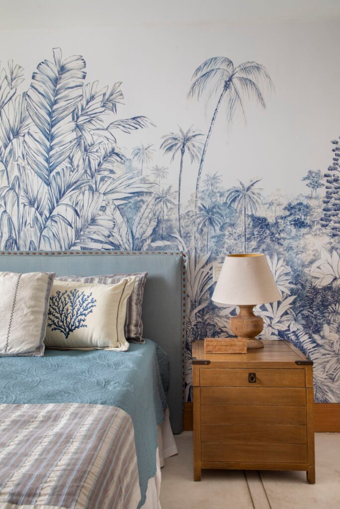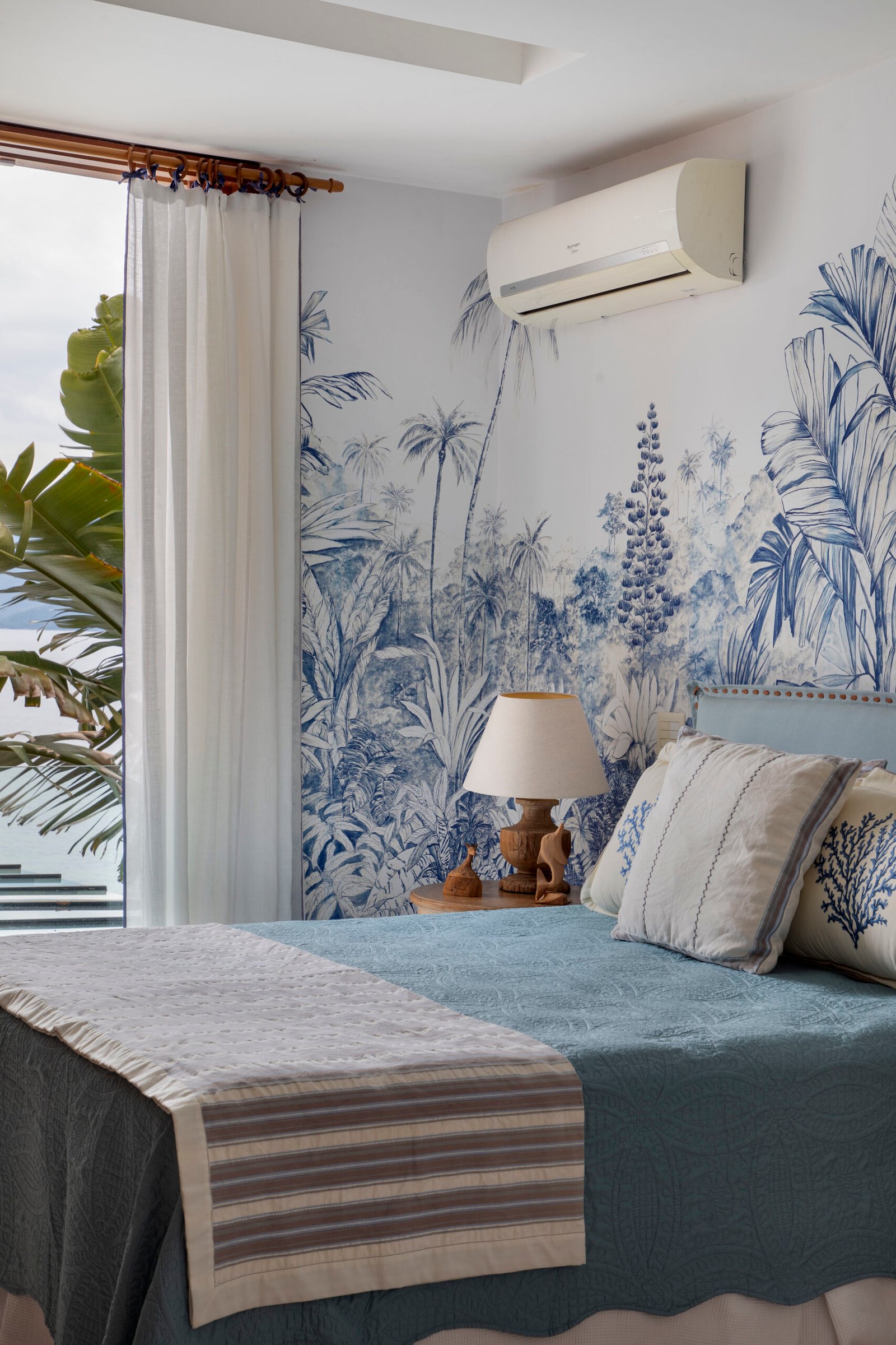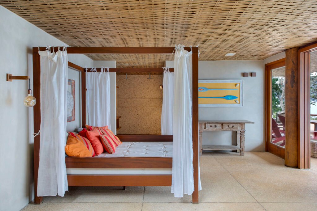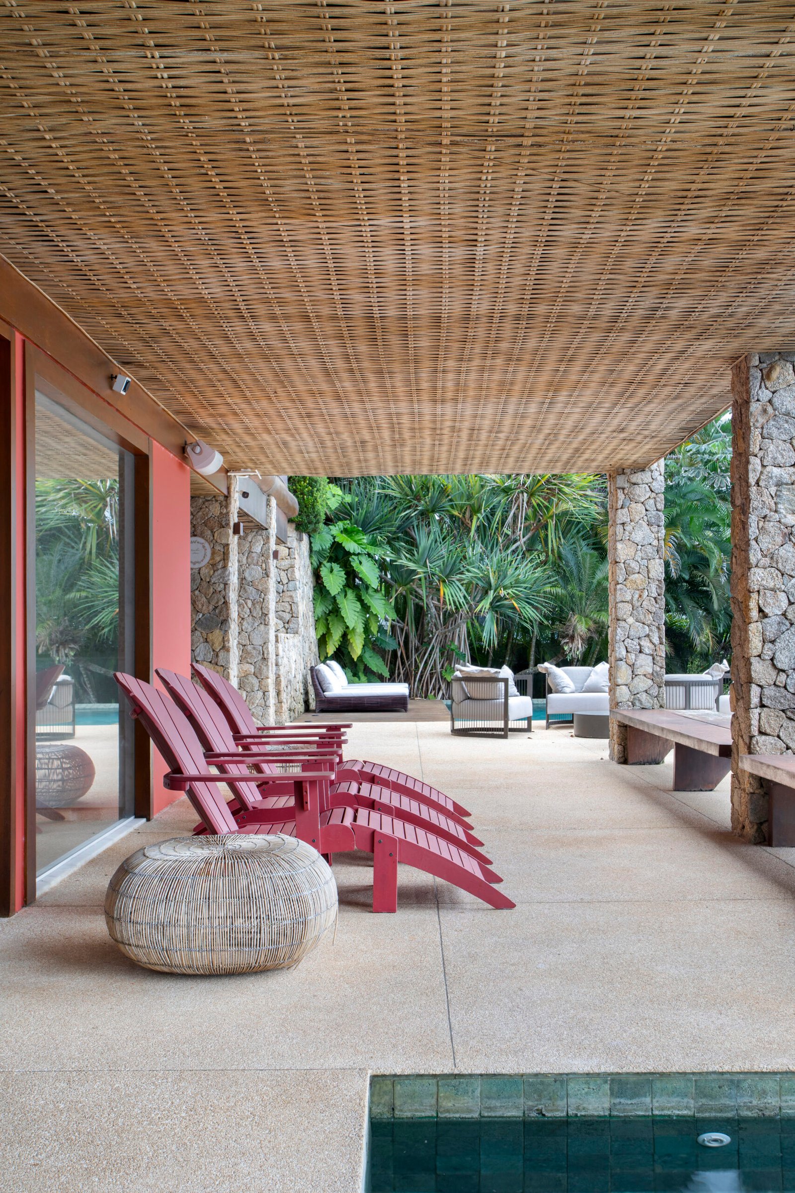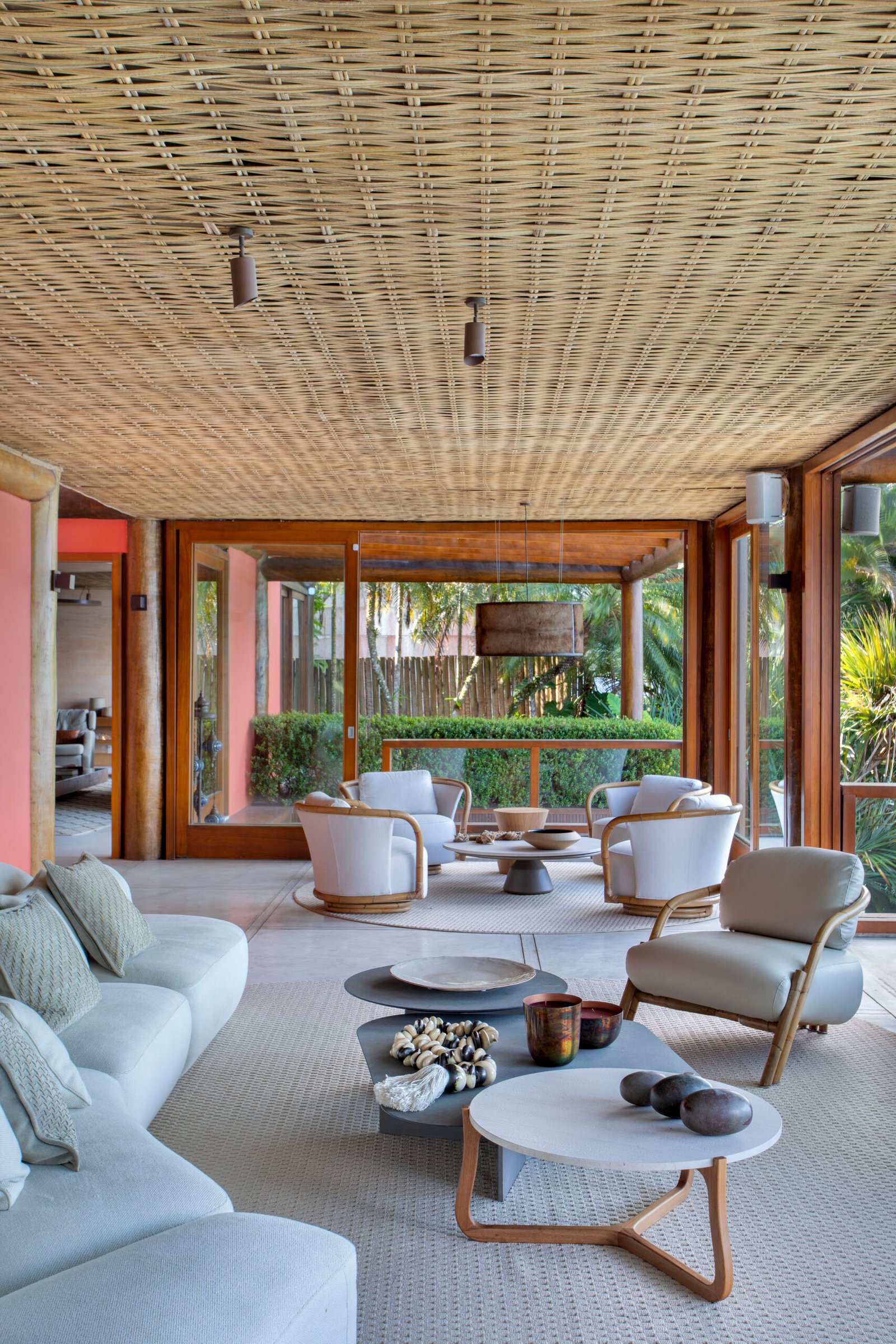 Decoração: Na decoração, com exceção de algumas peças que foram mantidas (como a cama e as mesas de cabeceira do quarto do casal, a mesa de jantar e o camão no spa), a maioria dos móveis e objetos é nova. A seleção do mobiliário da casa priorizou conforto, funcionalidade e integração com a natureza. As peças são grandes e acolhedoras, incentivando o relaxamento e a contemplação da paisagem. Um destaque são os móveis de design assinado, como as poltronas Astúrias, de Carlos Motta, na varanda voltada para o mar, que combinam conforto e sofisticação sem comprometer o estilo descontraído da casa de praia.
