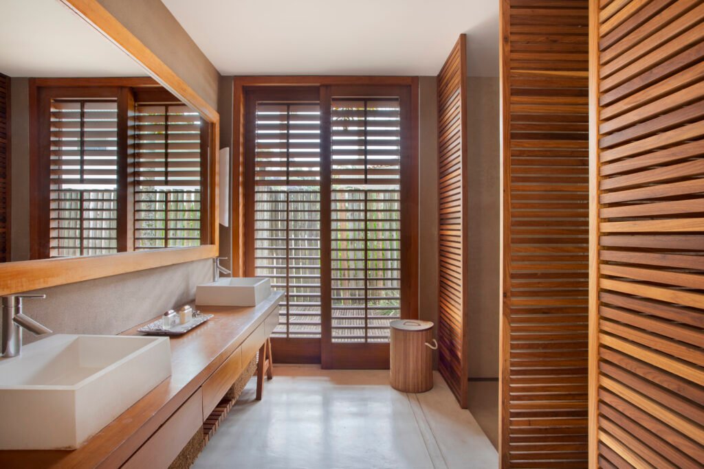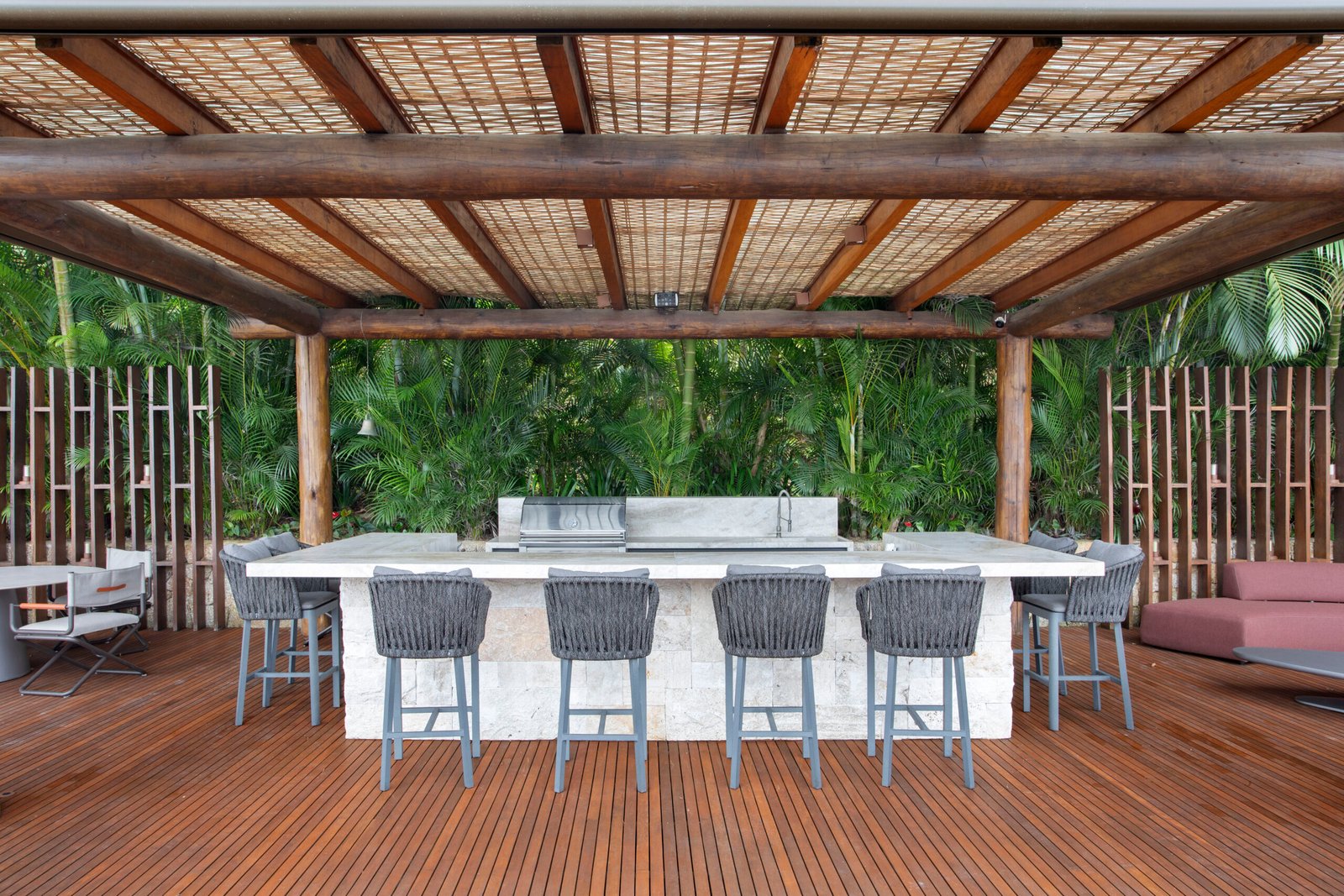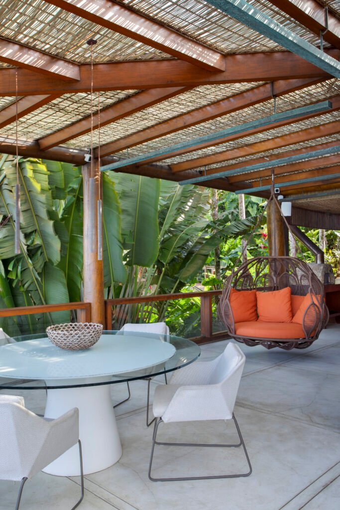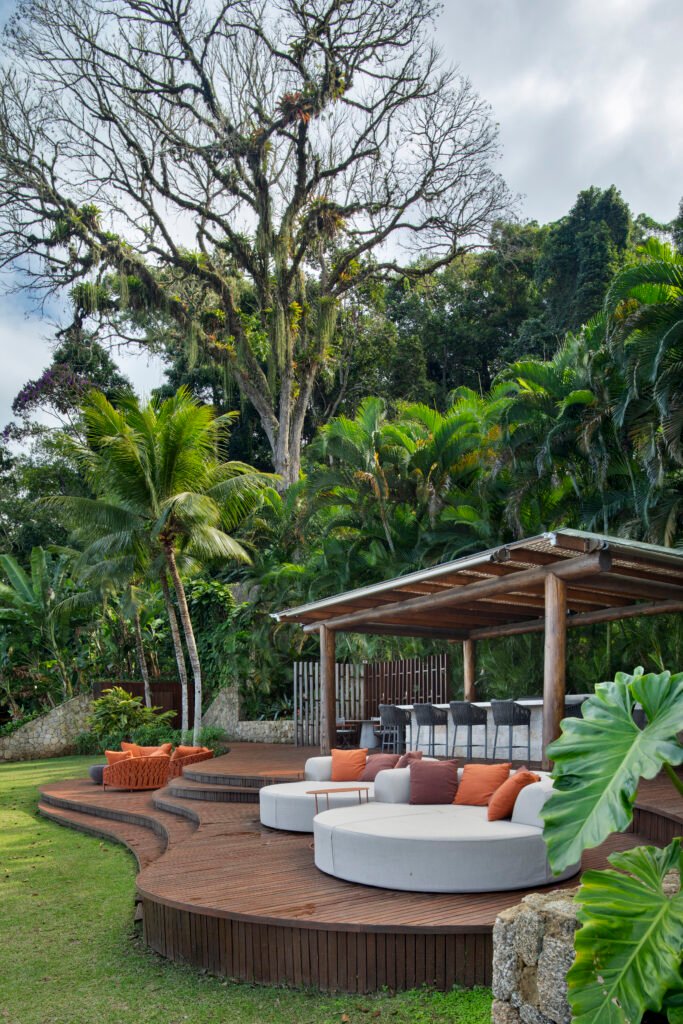 Maior desafio do projeto: “O maior desafio foi projetar o Lounge Gourmet de forma a integrá-lo à natureza e à casa principal. Para isso, criamos uma estrutura suspensa, permeável e com formas orgânicas, que reduzisse o impacto no terreno e preservasse a vegetação nativa. O projeto foi executado sem uso de concreto, garantindo uma construção reversível e em harmonia com o ecossistema local”, explica a arquiteta Mônica Gervásio.