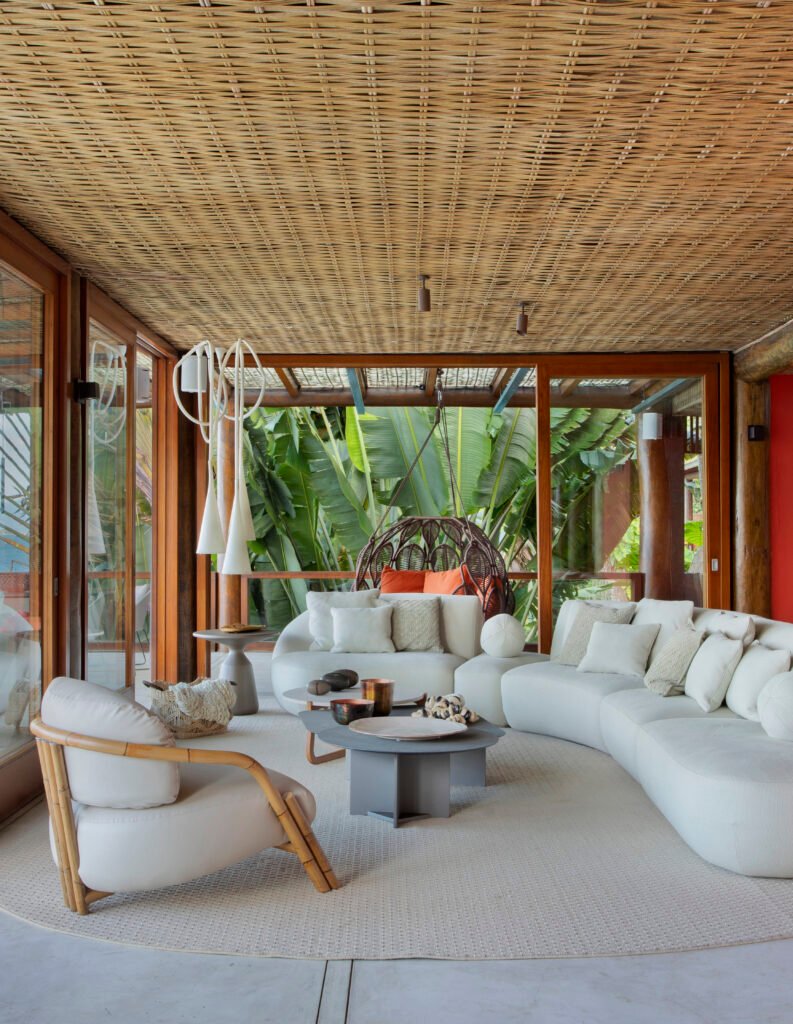 O conceito que orienta toda a proposta é o de uma casa de praia acolhedora, confortável e profundamente conectada à paisagem. Materiais naturais, tecidos leves, cores claras e iluminação indireta criam uma atmosfera relaxante, quase contemplativa. Poltronas, balanços e sofás generosos convidam a desacelerar, enquanto objetos artesanais e folhagens tropicais ajudam a construir um cenário que valoriza o tempo livre e o contato com a natureza. O estilo “Coastal Chic” aparece de forma sutil e elegante, sem excessos, privilegiando a sensação de bem-estar.