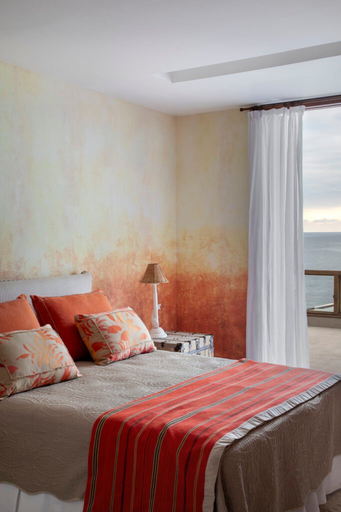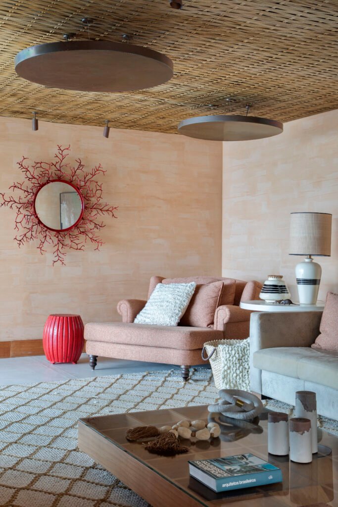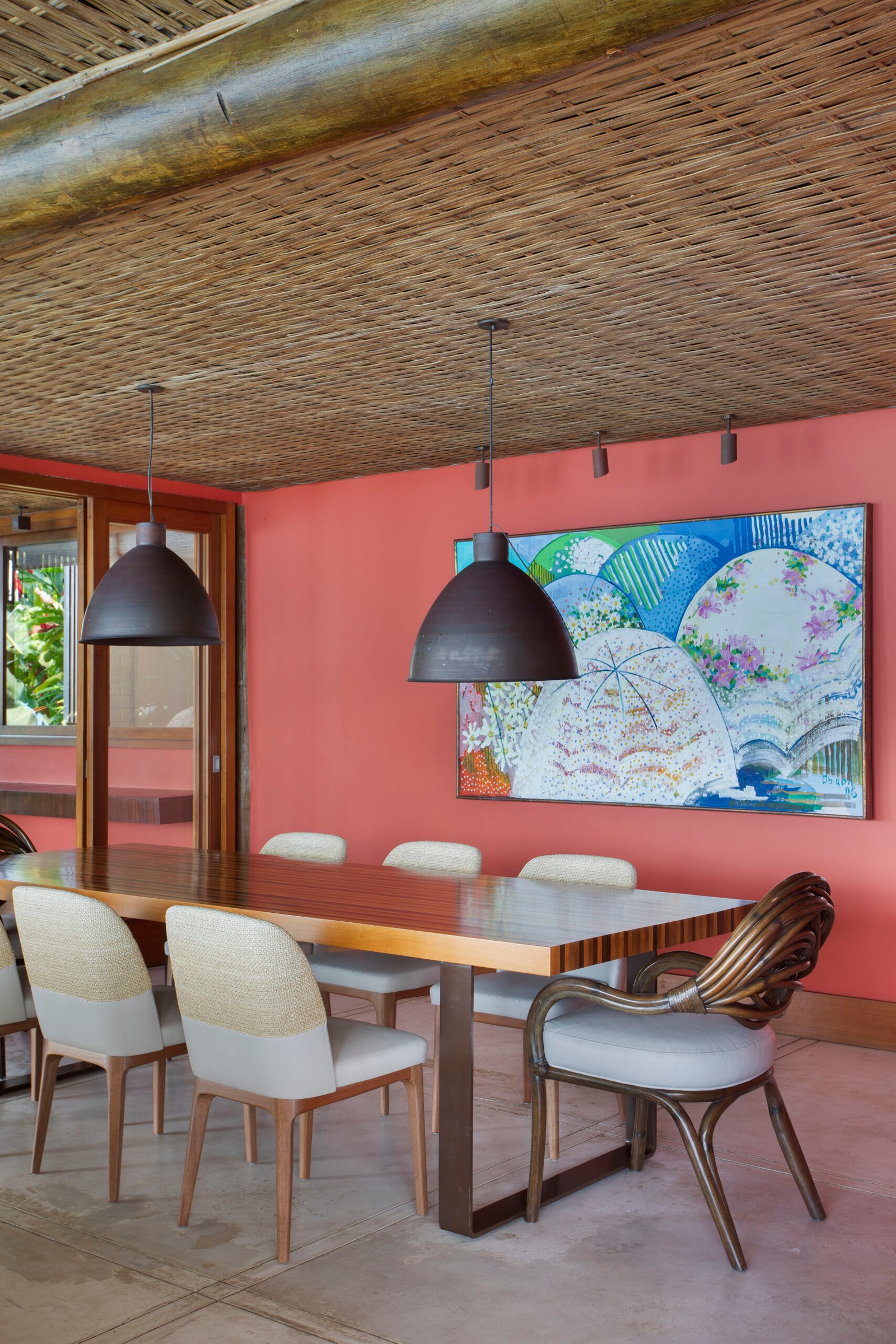 História do imóvel e do projeto: A arquiteta Mônica Gervásio já havia realizado outras intervenções na residência, reformando todos os banheiros, quartos e salas da casa principal, além das áreas de churrasqueira e spa. Na reforma atual, o foco foi a atualização do mobiliário e a modernização dos ambientes, acompanhando o crescimento dos filhos, sem alterar a planta original. Foram substituídos móveis, papéis de parede, texturas, objetos e quadros. Também foi criada do zero, à beira-mar, uma nova área de lounge, com um espaço gourmet anexo à casa, pensado para o pós-praia e para receber amigos em comemorações maiores. “A essência da arquitetura original foi preservada. Mantivemos a cor vermelha da casa e o seu estilo praiano, que continua sendo uma marca muito forte do projeto”, explica a arquiteta Mônica Gervásio.