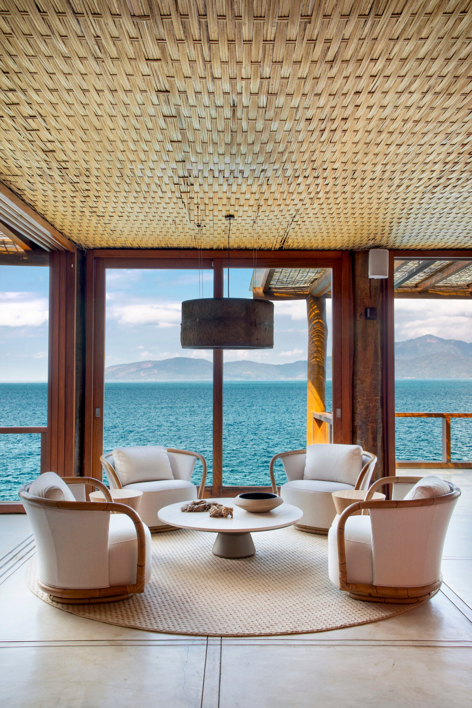 Paleta de coresda decoração: A paleta de cores foi pensada para refletir e valorizar a natureza ao redor, criando unidade visual, leveza e sensação de acolhimento. Tons neutros e claros, como branco, bege e off-white, servem de base, refletindo a luz natural e remetendo à areia e às conchas. Toques sutis de azul e verde-água evocam o mar e a vegetação local, enquanto madeira clara e palha em móveis e acabamentos adicionam calor e textura. A proposta foi criar um fundo elegante que realça a verdadeira protagonista do projeto: a paisagem natural.
