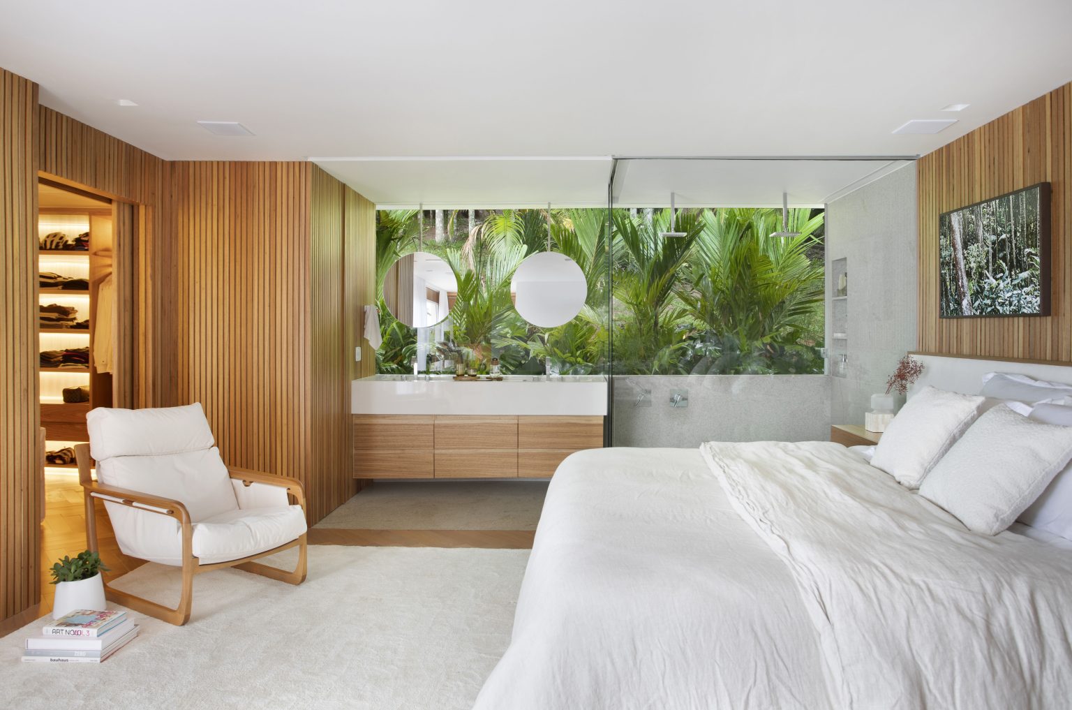 Os arquitetos aproveitaram o fato de haver um jardim na parte de trás da casa para fazer um imenso rasgo na parede (fechado em vidro) e assim trazer o verde para dentro do espaço. Até o lado do box com chuveiro voltado para o dormitório é totalmente de vidro para não impedir a conexão indoor/outdoor.