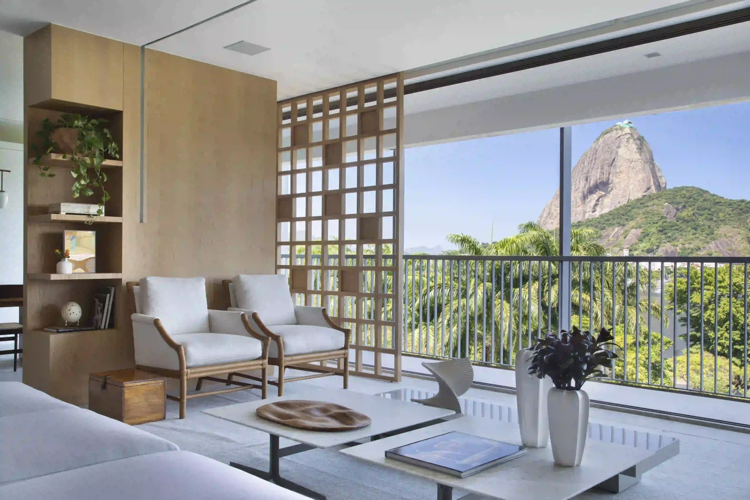 No setor social há uma presença forte do design modernista brasileiro, valorizado através de importantes composições, com destaque para o par de cadeiras Curva assinadas por Joaquim Tenreiro (da década de 60) e o conjunto de cadeiras Lucio assinadas por Sérgio Rodrigues, em 1956. Dimensões, alturas, volumes… todas as proporções do mobiliário foram pensadas para não haver interferência no visual estonteante da Urca. A marcenaria autoral desenhada pela própria designer inclui, por exemplo, as estantes gêmeas que ocupam as paredes laterais do living – cada uma com funções bem definidas. Já a estante do jantar acomoda louças, nicho para adega e um aparador horizontal com tampo e fundo de Dekton, que funciona como apoio da mesa de jantar e ainda conta com gavetas para acessórios de vinho. “Para acompanhar a amplitude do vão da extensa varanda, propus painéis deslizantes com placas aplicadas em carvalho americano, cujo efeito cria um ritmo com luz e sombra e funciona como um pano de fundo para a sala de estar. Os grandes painéis correm em trilhos discretos encaixados no piso e no forro de gesso, permitindo brincar com as formas dos desenhos e, de certa forma, proteger os ambientes quando se deseja aconchego e privacidade”, explica Devisate. A ideia de emoldurar a paisagem e criar um elemento de luz e sombra delicado para a fachada surgiu em conversa com os clientes, que são apaixonados por muxarabis – repare que o mesmo desenho quadriculado se repete no biombo presente na lateral do hall social. A pedido deles, todo o piso em mármore existente no setor social foi preservado e restaurado, e o tom areia do material aparece também nas bancadas (em Dekton by Cosentino, fornecidos pela Guandu Marmoraria) da cozinha e das salas de estar e jantar.