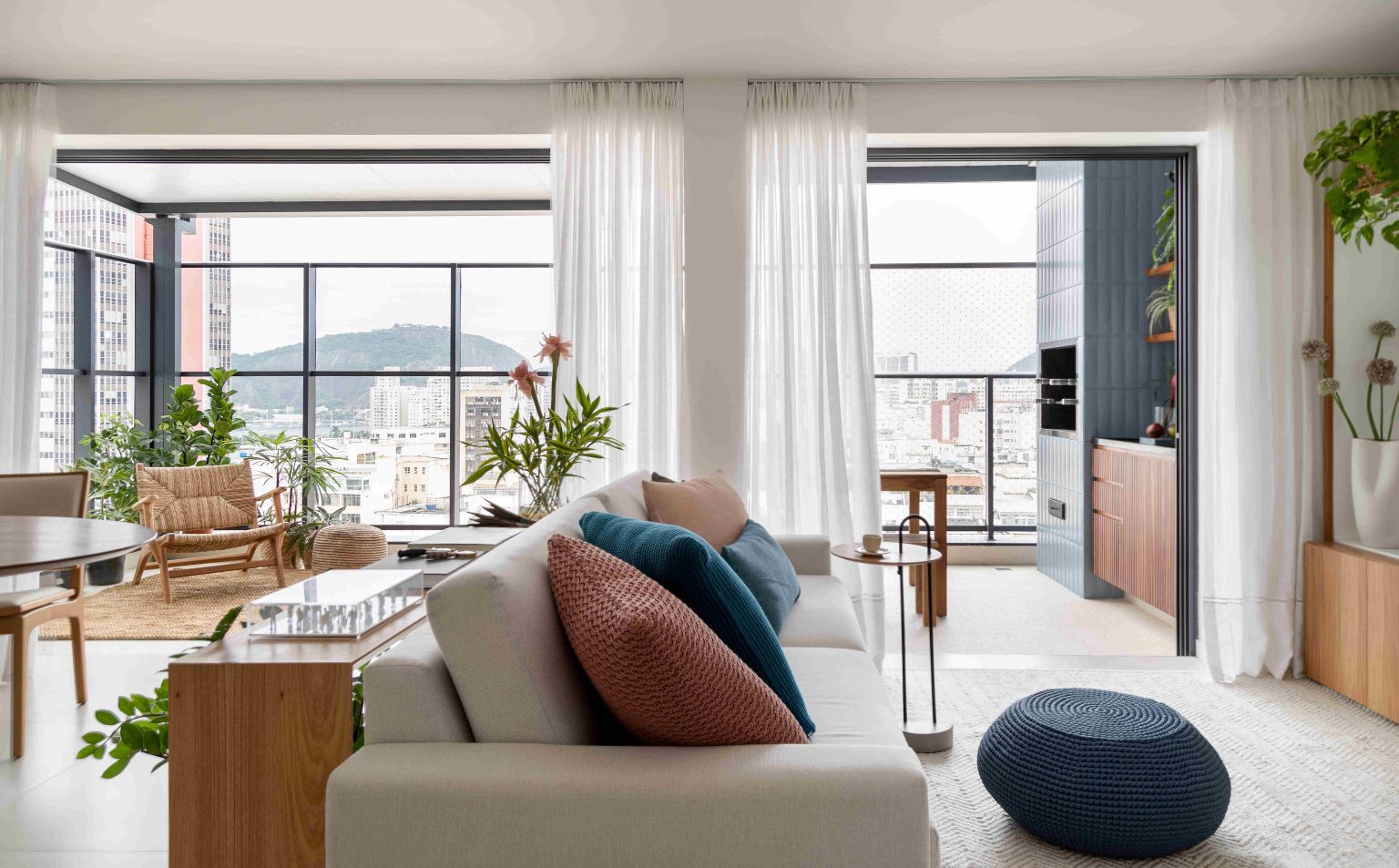 Em 2020, durante a pandemia, um casal na faixa dos 40 anos (engenheiro e advogada), com dois filhos pequenos (de 6 meses e 2 anos), comprou esta cobertura duplex de 140m2, no Flamengo (zona sul do Rio de Janeiro), ainda na planta e logo encomendou um projeto aos arquitetos Marina Romeiro e Felipe Maia, do escritório Maia Romeiro Arquitetura (@mr.maiaromeiro). “Eles preferiram deixar o projeto aprovado e orçado para iniciar as obras assim que recebessem as chaves da construtora e nos pediram um imóvel claro, iluminado e arejado, com décor contemporâneo e, ao mesmo tempo, despojado”, conta Marina. Além de atender aos pedidos do casal, a dupla investiu ainda na integração, na funcionalidade e na facilidade de manutenção dos espaços.