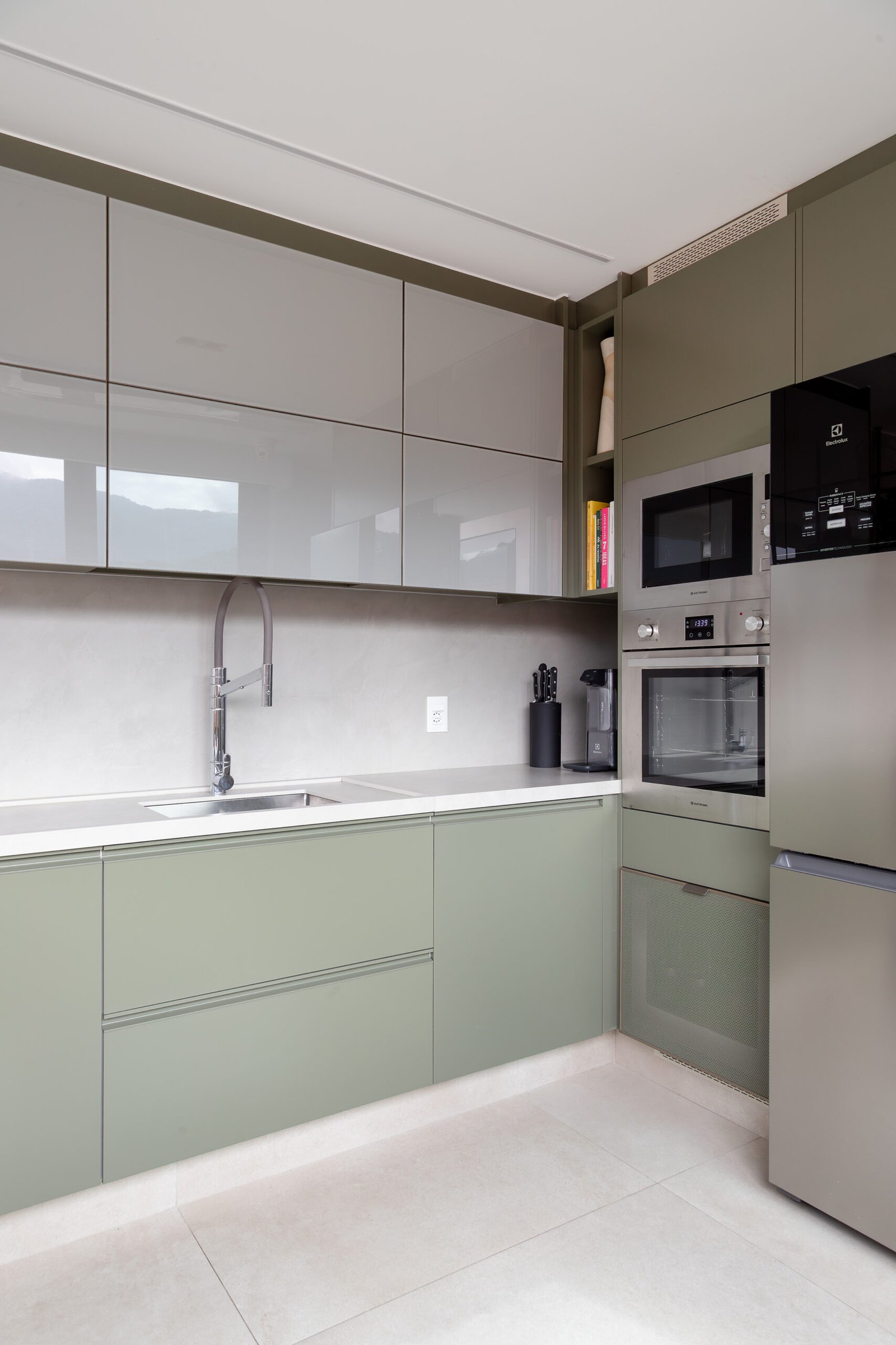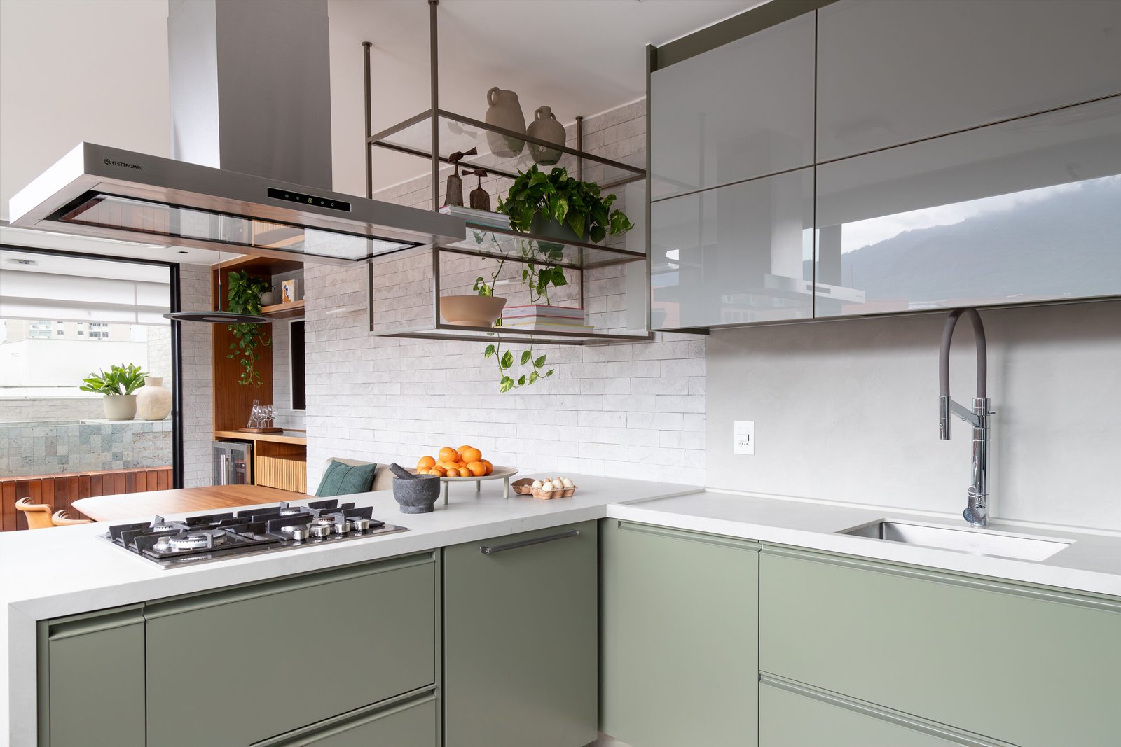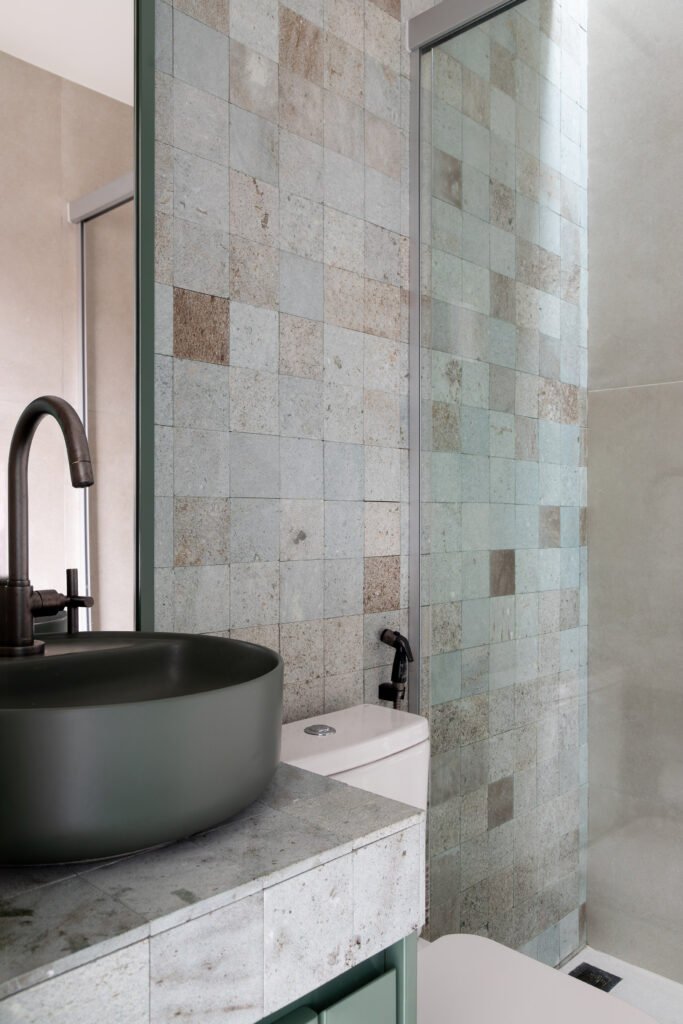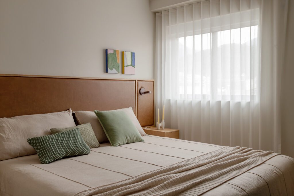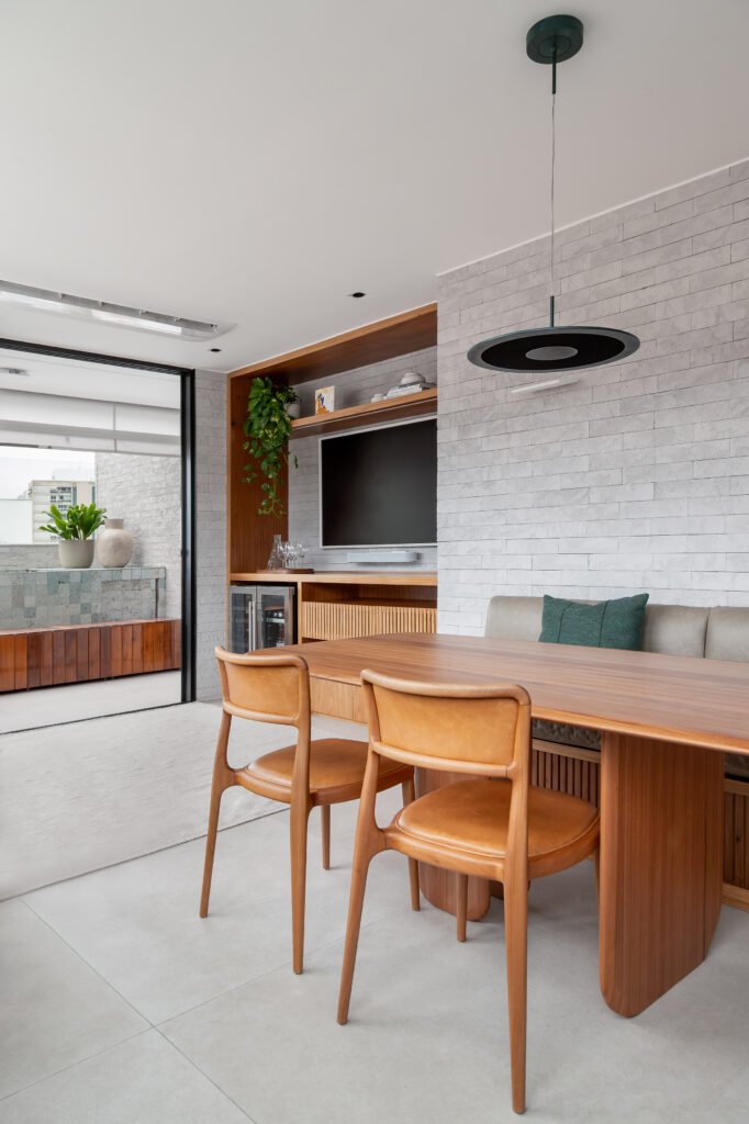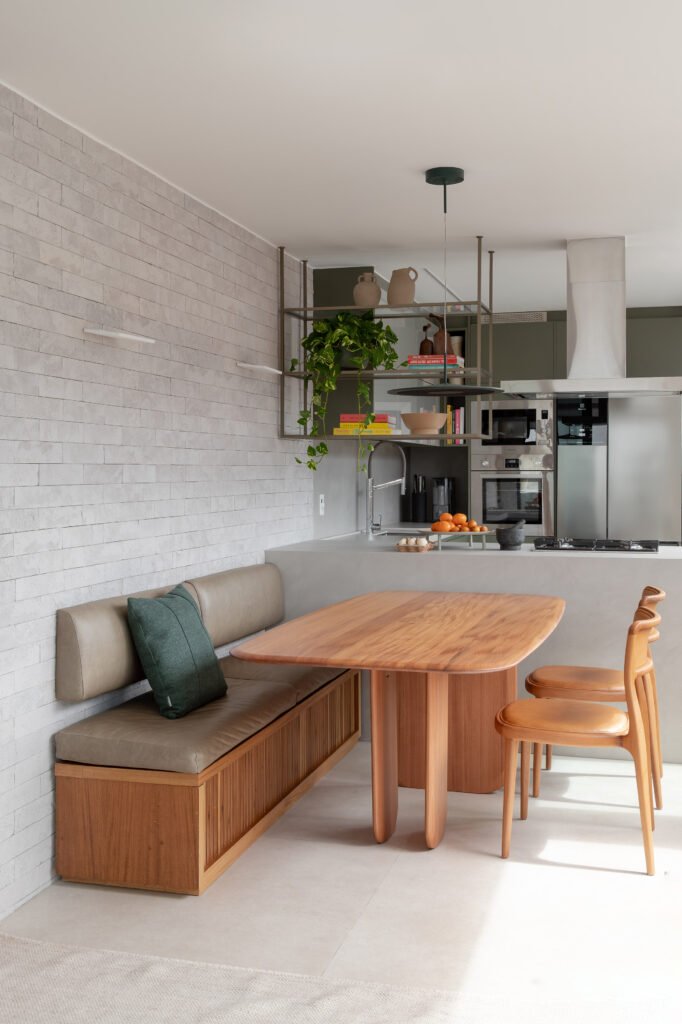O conceito contemporâneo do projeto combina funcionalidade e estética. A paleta neutra — com cinza claro no porcelanato e no tijolinho de concreto, e toques de verde na marcenaria da cozinha, na piscina e em outros detalhes — cria uma atmosfera integrada e serena. Elementos em madeira e linho, aliados a peças de design, como a mesa lateral de Luia Mantelli, conferem leveza e aconchego.
