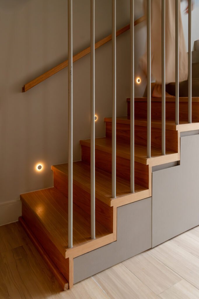 O projeto começou a ser planejado em 2021, enquanto a família ainda morava na Bolívia e adquiriu o imóvel na planta. A reforma só teve início em 2024, após a entrega do apartamento pela construtora. “Os clientes são amigos de longa data, já havíamos desenvolvido outros projetos para eles”, comenta Marina. O grande diferencial foi a criação de um novo andar superior, inexistente na planta original, que transformou a cobertura de 84 m² (67 m² de área coberta e o restante em varanda) em um imóvel com dois pavimentos e 136 m².