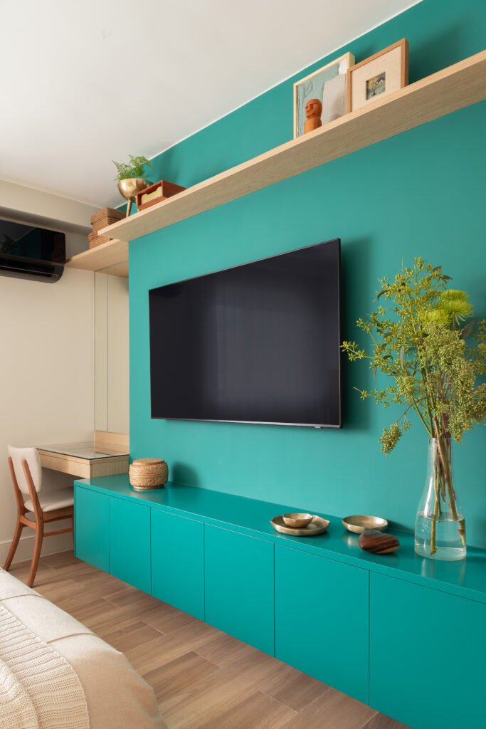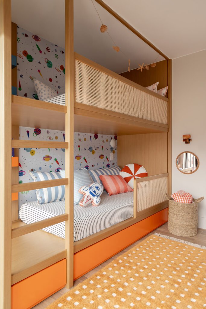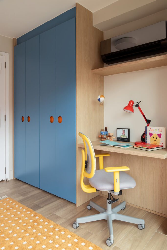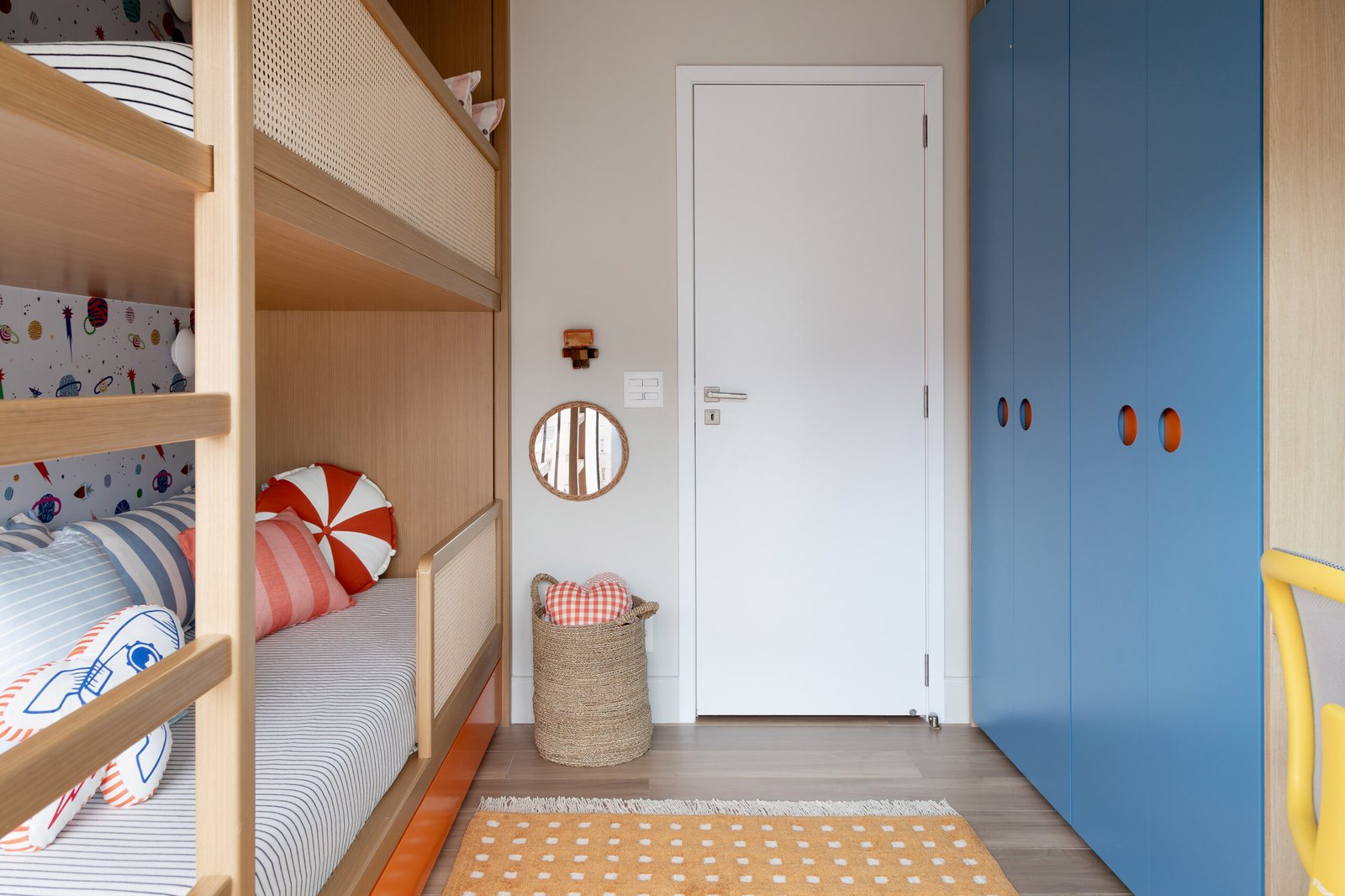 A marcenaria inteligente foi fundamental para atender às necessidades da família: cada peça tem múltiplas funções, como o banco da sala de jantar que funciona como baú, o banco da piscina que armazena equipamentos, a beliche com bicama no quarto das crianças e a penteadeira da suíte do casal, usada também como mesa de trabalho. “O maior desafio foi encaixar todas as necessidades da família dentro do espaço disponível. Cada centímetro fez diferença, mas conseguimos que tudo funcionasse perfeitamente”, destaca Marina.
