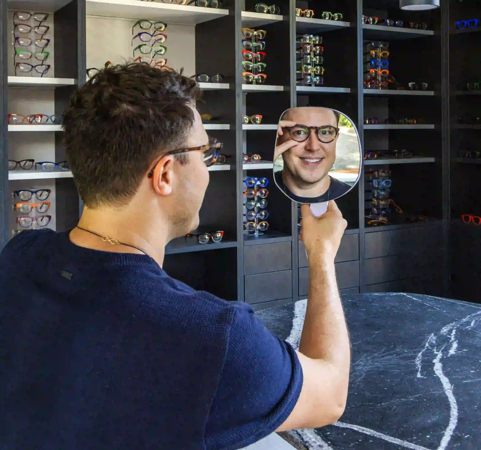 A partir de um módulo estrutural adaptado, com 30m2, e um deck-lounge com 40m2, Ravaglia criou muito mais do que uma loja de óculos ao adotar soluções e materiais que instigam permanentemente o olhar. “Quando escolhi fazer a ótica, logo me vieram à mente as lentes dos óculos e as reflexões, como elas tem o poder de aproximar e afastar o que enxergamos através do jogo entre o côncavo e o convexo. A partir daí, surgiu a ideia de projetar espelhos posicionados de forma a iludir o olhar, estimulando, desta forma, a curiosidade, a interação e envolvimento do público, como o espelho com efeito infinito”, conta ele. Até mesmo o teto da loja foi revestido com espelhos que alteram a noção de perspectiva e profundidade do espaço, enquanto uma instalação, composta de círculos espelhados (de diferentes alturas e diâmetros) que dividem espaço com as plantas naturais nos jardins da área externa. “Essas esculturas representam as lentes das armações dos óculos e convidam os visitantes a enxergar o espaço sob novas perspectivas”, explica o arquiteto.