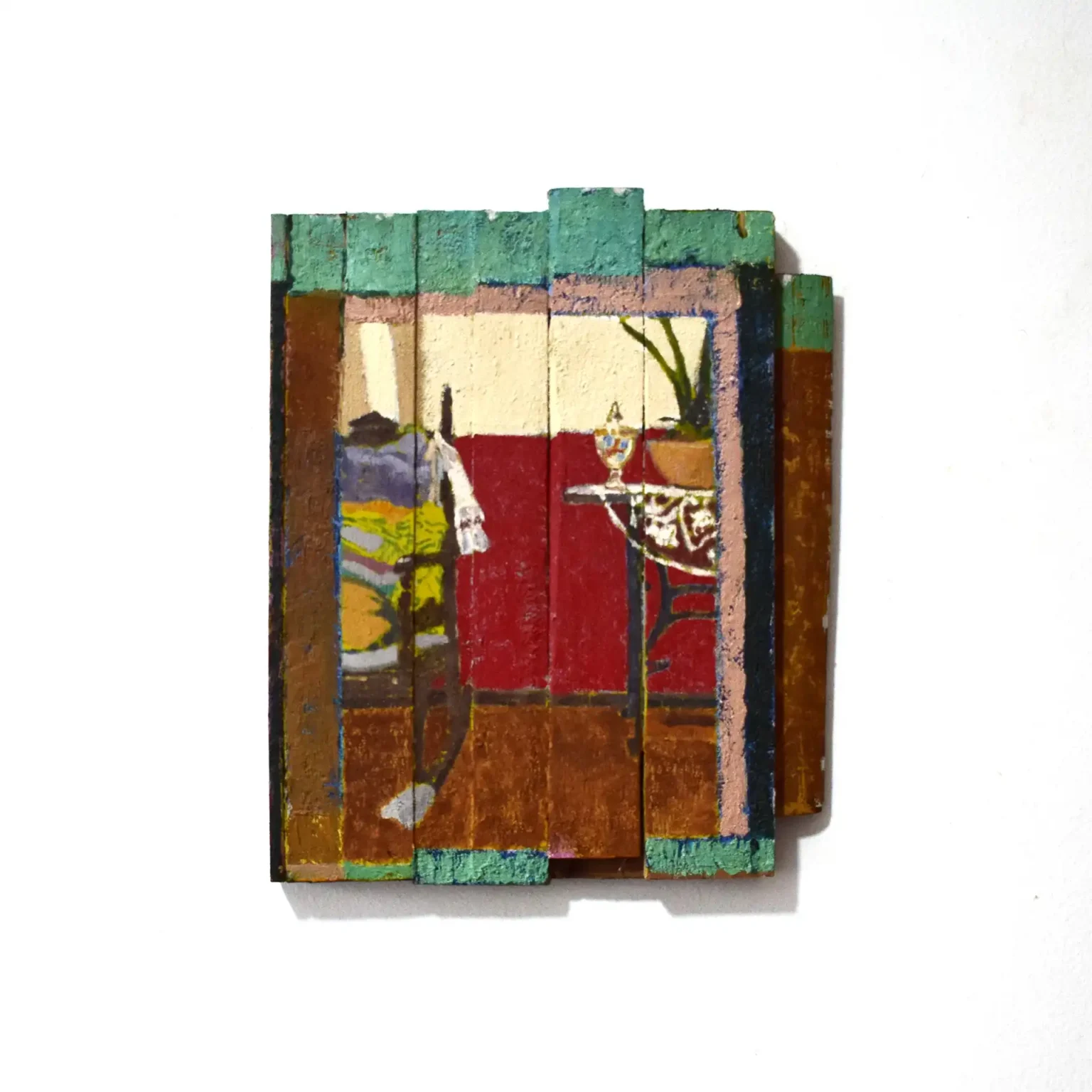 Uéslei Fagundes (1987, Novo Hamburgo – RS) é mestrando em Poéticas Visuais pela UFRGS, com pesquisa voltada à representação do cotidiano na pintura. Utiliza madeiras coletadas como suporte, explorando memórias e vestígios do tempo. Suas obras combinam cenas simples com inscrições prosaicas, criando um vocabulário pictórico que revela e oculta fragmentos entre frestas e superfícies marcadas.
