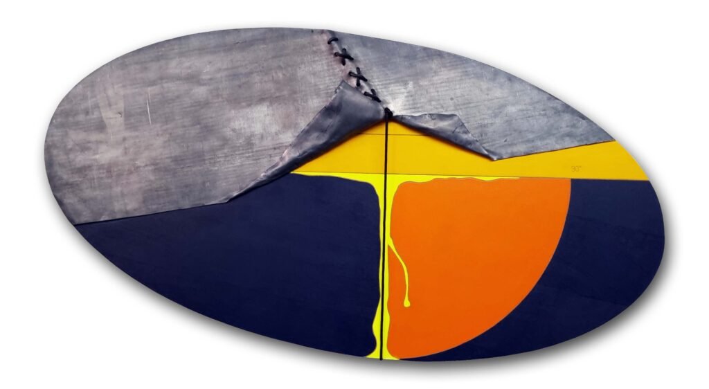 Haverá também uma série com nove obras amarelas em caixa de acrílico nas quais o artista coloca elementos diversos, como um prumo (instrumento usado na construção civil para garantir a verticalidade de estruturas), bolas de tênis pintadas de preto e placas de chumbo. “Nesta coletânea uso uma série de linguagens com vários suportes diferenciados, que vão da aquarela à escultura, tudo dentro de caixas de acrílico. As placas de chumbo, por exemplo, são marteladas e costuradas na madeira para dar um aspecto de matéria orgânica”, explica o artista.