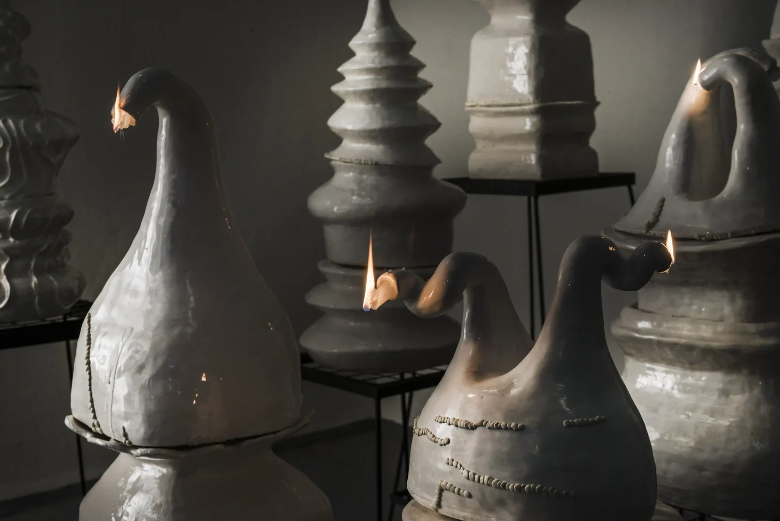 “Neste contexto em que vivíamos, a imagem da chama invertida e a associação dessa ação de reversão me provocaram muito. Pensava em como sustentar a vela e o fogo ao revés. Comecei a desenhar e produzir alguns testes com corpos cerâmicos que tivessem em suas extremidades uma angulação máxima de torção para baixo, contendo uma vela e queimando ao menos por segundos até ser apagada por seu próprio corpo em estado líquido. O primeiro grupo destes corpos cerâmicos é realizado em 2022, depois de um processo de estudos com diferentes angulações de queima e formatos”, complementa Ayla.