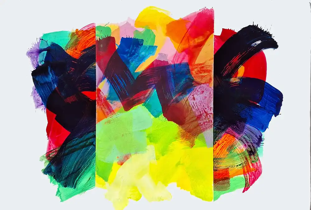 Na transposição das experiências em aquarela, que vem desenvolvendo desde 2023 sobre papel, para a pintura em tela, Mangiavacchi recorre à fluidificação da tinta acrílica, construindo camadas sucessivas que se sobrepõem e se revelam. O resultado são composições que exploram amplas gamas cromáticas, em um delicado equilíbrio entre controle e acaso.
