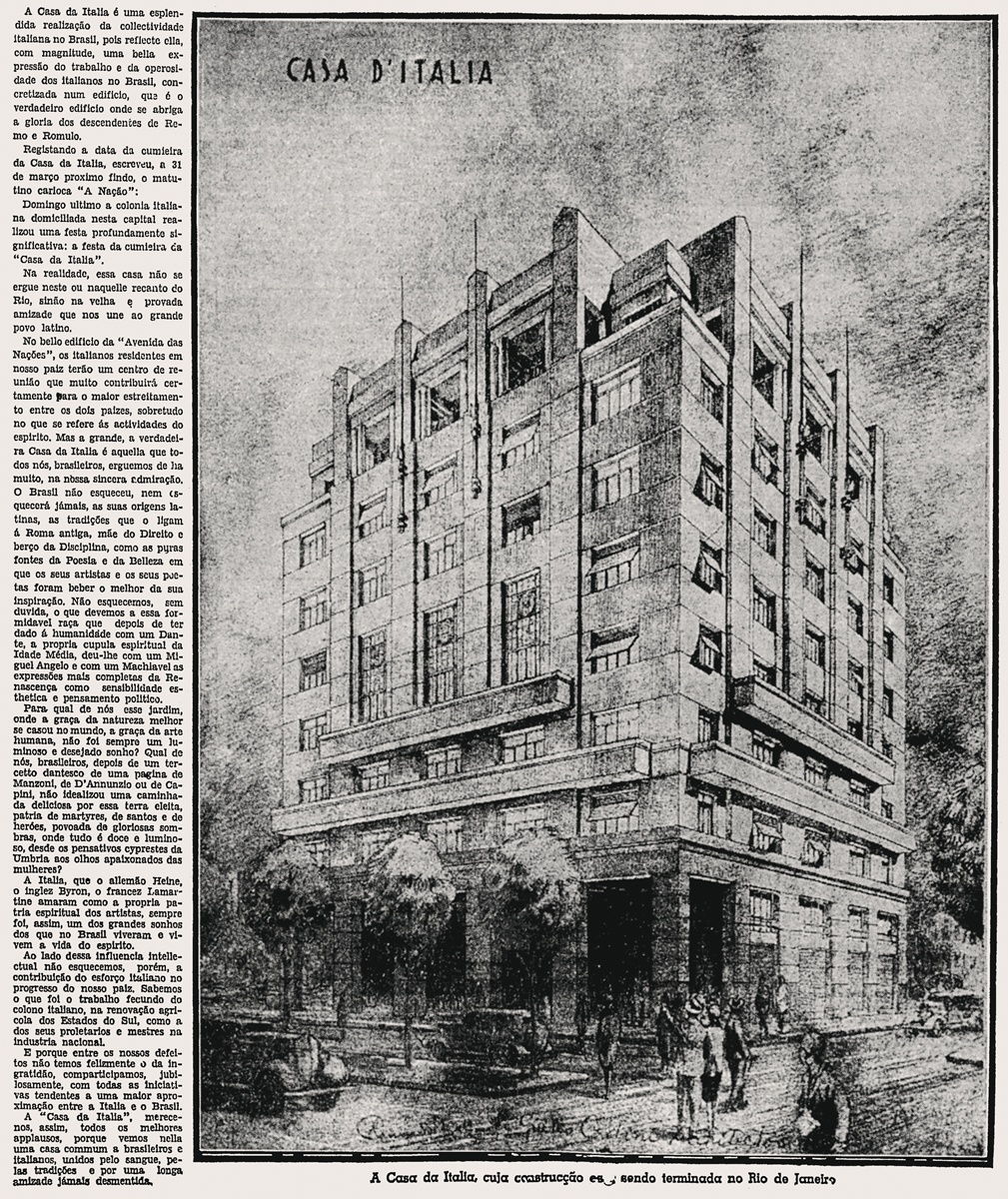 Polo Cultural ItaliaNoRio inaugura, em 1º de abril, a exposição “Casa d’Italia do Rio de Janeiro: 90 anos”, com curadoria de Aristides Corrêa Dutra. A mostra celebra as nove décadas da aquisição do terreno onde seria erguida a Casa d’Italia — localizado na esquina das avenidas Beira-Mar e Santos Dumont (atual Avenida Antônio Carlos) — e revisita a trajetória histórica, política e cultural de um dos marcos da presença italiana na cidade. Ao longo de sua história, o edifício atravessou diferentes períodos e transformações, incluindo momentos de interrupção e reconfiguração de sua função, até chegar à recente revitalização da Praça Italia, reafirmando sua importância no cenário cultural do Rio de Janeiro.