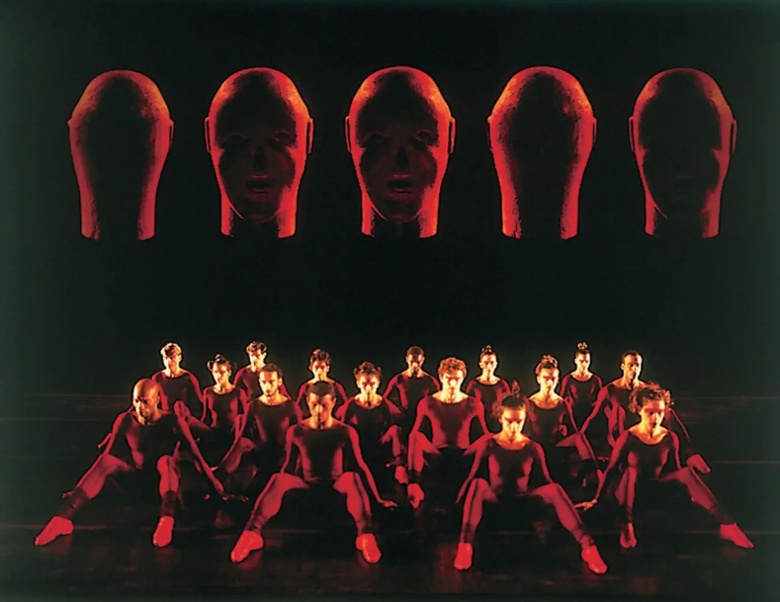 O linóleo é vermelho e o cenário virtual, projetado por Paulo Pederneiras, faz a sincronização de luzes vermelhas em diversas saturações, muitas vezes acompanhando a trilha e dialogando com graves e agudos; um quadrado branco delimita, aqui e ali, o espaço cênico.