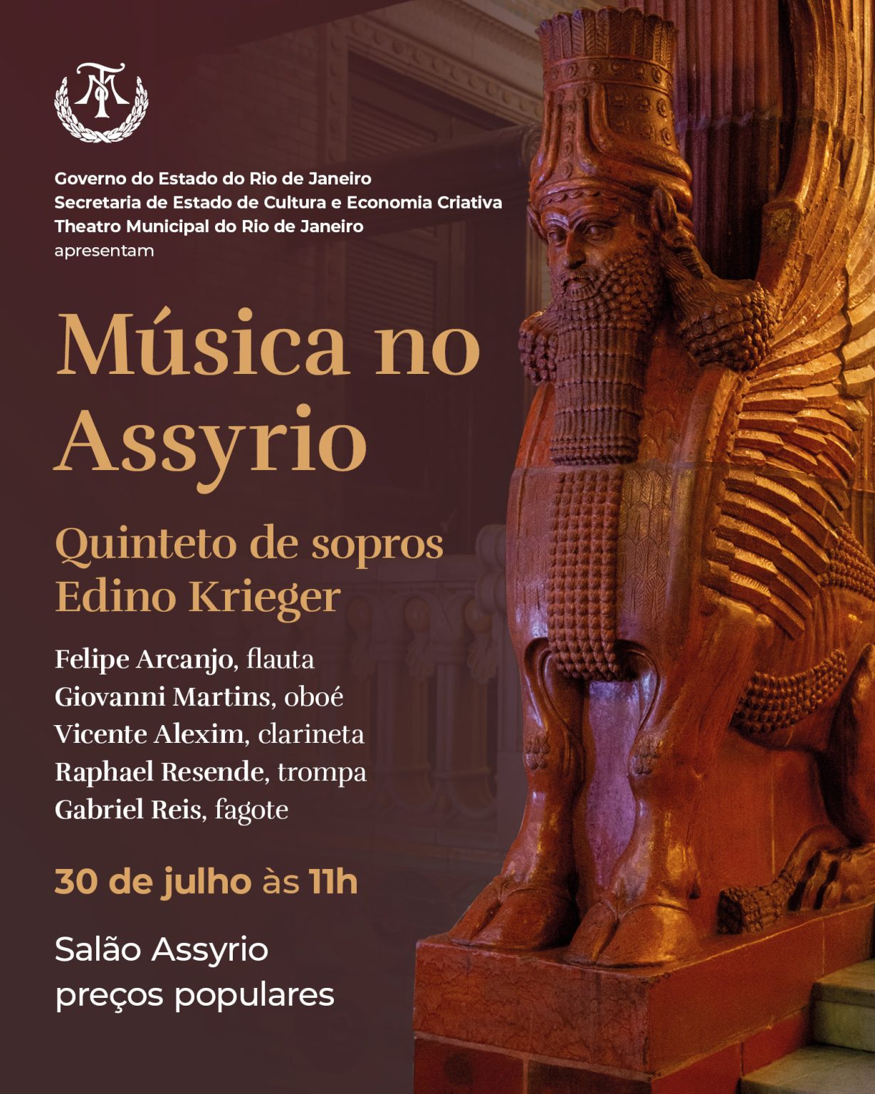 Quinteto de sopros Edino Krieger é uma homenagem a um dos maiores compositores brasileiros que sempre nos brindou com o melhor da música contemporânea brasileira. Formado por músicos atuantes nas principais orquestras da cidade, tem como proposta observar e respeitar a tradição de música para sopros, explorando novos espaços possíveis com a expressão na música de câmara. A apresentação do Quinteto acontecerá no próximo domingo, dia 30 de julho,no Salão Assyrio, no Theatro Municipal do Rio de Janeiro, às 11h. Os ingressos custam R$20 e R$10 reais e estão à venda no site theatromunicipal.rj.gov.br ou na bilheteria do Theatro.