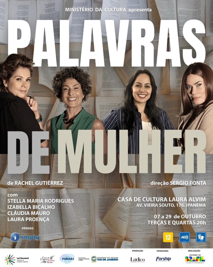 Após estreia em 2024 no Teatro Cândido Mendes, em Ipanema, o espetáculo Palavras de Mulher retorna aos palcos cariocas para uma nova temporada no Teatro Laura Alvim, de 07 a 29 de outubro de 2025, sempre às terças e quartas, às 19h. Com texto da escritora e poeta Rachel Gutiérrez e direção artística de Sergio Fonta, a montagem propõe uma celebração da literatura brasileira por meio das vozes de quatro grandes autoras: Carmen da Silva (Stella Maria Rodrigues), Eneida de Moraes (Izabella Bicalho), Hilda Hilst (Claudia Mauro) e Clarice Lispector (Laura Proença).