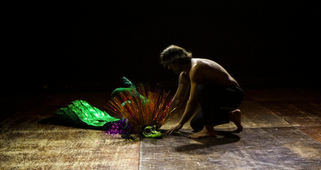 “Durante o desenvolvimento do CASA COMUM, vivendo uma residência artística de um mês na Amazônia — entre rios, florestas e cidades —, atravesso uma navegação de um dia inteiro com o povo Sateré-Mawé. É nesse estado de escuta profunda, entre o real e o mítico, que surge o insight: a Cuca. Não como a figura do medo infantil, mas como um visage, uma ponte entre mundos, entre o planeta e o universo mágico do carnaval, como um possível lugar de fala. Dessa forma, para mim, ela passa a encarnar o espírito do carnaval da Estação Primeira de Mangueira — território simbólico afetivo de onde posso puxar o fio das mulheres da minha família, convocar minha avó pernambucana, acessar uma linhagem ancestral feminina e, a partir daí, dialogar com minha filha sobre o futuro que se constrói no agora. A Cuca se materializa pela primeira vez em 2024, no Carnaval do Rio de Janeiro, como figura do carnaval de rua carioca, desfilando nas ruas da cidade pelos arredores da Sapucaí e durante o cortejo do Cordão do Boi Tolo. Ao se trajar de Verde e Rosa, ela carrega as cores do lugar onde cresci, o Maracanã. Minha avó morava perto da Mangueira; essa relação é antiga, afetiva, estrutural. Essa é a Cuca ancestral. Ao encarná-la, invoco minha avó, invoco as mulheres que me antecedem, para falar com Julieta — e falar do mundo. A cada aparição, acompanhada por videomaker e fotógrafa, a Cuca gera material audiovisual e se transforma. Ela é pesquisa viva. Troca de pele. No segundo ano, surge em vermelho: cor do amor de pai para filha, mas também do sangue, da encruzilhada, da escuta e do movimento. A cor de Exu, o dono do carnaval, aquele que pede licença, que abre caminhos, que governa o carnaval e permite a travessia entre mundos. E ela desfila no cortejo do Bloco Tecnomacumba, da artista Rita Benneditto, além de participar também do desfile do Cordão do Boitatá. Esse projeto, que transborda para múltiplas linguagens, encontra finalmente sua forma como uma performance transmídia no Futuros – Artes e Tecnologia, um lugar profundamente ligado à minha trajetória. Voltar ao Futuros para estrear A Cuca tem, portanto, uma dimensão simbólica e afetiva profunda. É a inauguração da Cuca na cena contemporânea carioca, como um espetáculo. É também meu retorno aos palcos como ator, depois de quase quinze anos — meu primeiro solo. Nada poderia ser mais apropriado do que fazê-lo nesse espaço onde arte, tecnologia, memória e futuro se cruzam. Afinal, no fundo, tudo começa — e continua — tentando responder à mesma pergunta: que mundo estamos deixando para quem vem depois? A Cuca, é também sobre celebrar a vida que é passada de geração a geração e a existência. Sobre viver, trocar de pele e gestar mundos. É sobre a responsabilidade de abrir os caminhos pros que vem depois, ocupar os espaços, exaltar a alegria e o amor. Sobre pulsão de vida, beleza, poesia e carnaval. É sobre também reinventar memórias e habitats, e refundar uma sociedade mais igualitária e empática. O projeto se dá em campo expandido e ampliado, esgarçando visões e tensionando lugares pré-estabelecidos.”