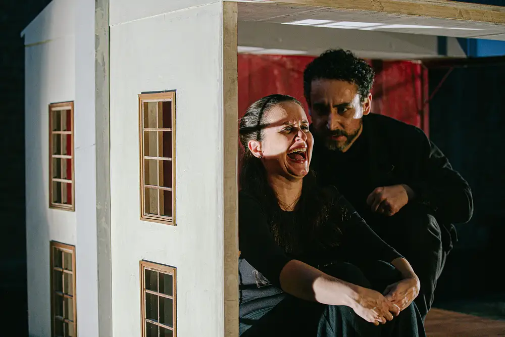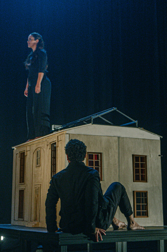 A encenação organiza um sistema em que luz, trilha sonora, figurino e espaço não ilustram a ação, mas operam como extensão das rubricas do texto, tornando visível aquilo que se passa no limite entre o que é dito e o que permanece em suspensão. A pequena casa em cena, longe de qualquer realismo, funciona como um dispositivo de pressão: um lugar onde o passado insiste, onde as versões colidem e onde o tempo parece poder ser interrompido.