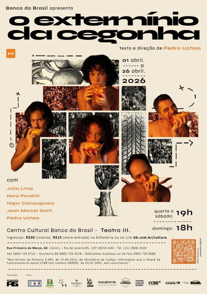 Divertido, provocador e atual. Assim pode ser entendido “O Extermínio da Cegonha”, espetáculo que estreia dia 1º de abril de 2026 às 19h no Teatro III do Centro Cultural Banco do Brasil Rio de Janeiro propondo um encontro entre gerações que pensam e sentem o mundo de maneiras muito diferentes, trazendo à cena tensões que atravessam tecnologia, memória, desejo e responsabilidade. Escrita e dirigida por Pedro Uchoa, que também integra o elenco ao lado de Higor Campagnaro, Jean Marcel Gatti, Julia Limp e Nara Parolini, a montagem tem como ponto de partida a investigação do poder da tecnologia e as consequências das interferências tecnológicas no comportamento da sociedade atual.