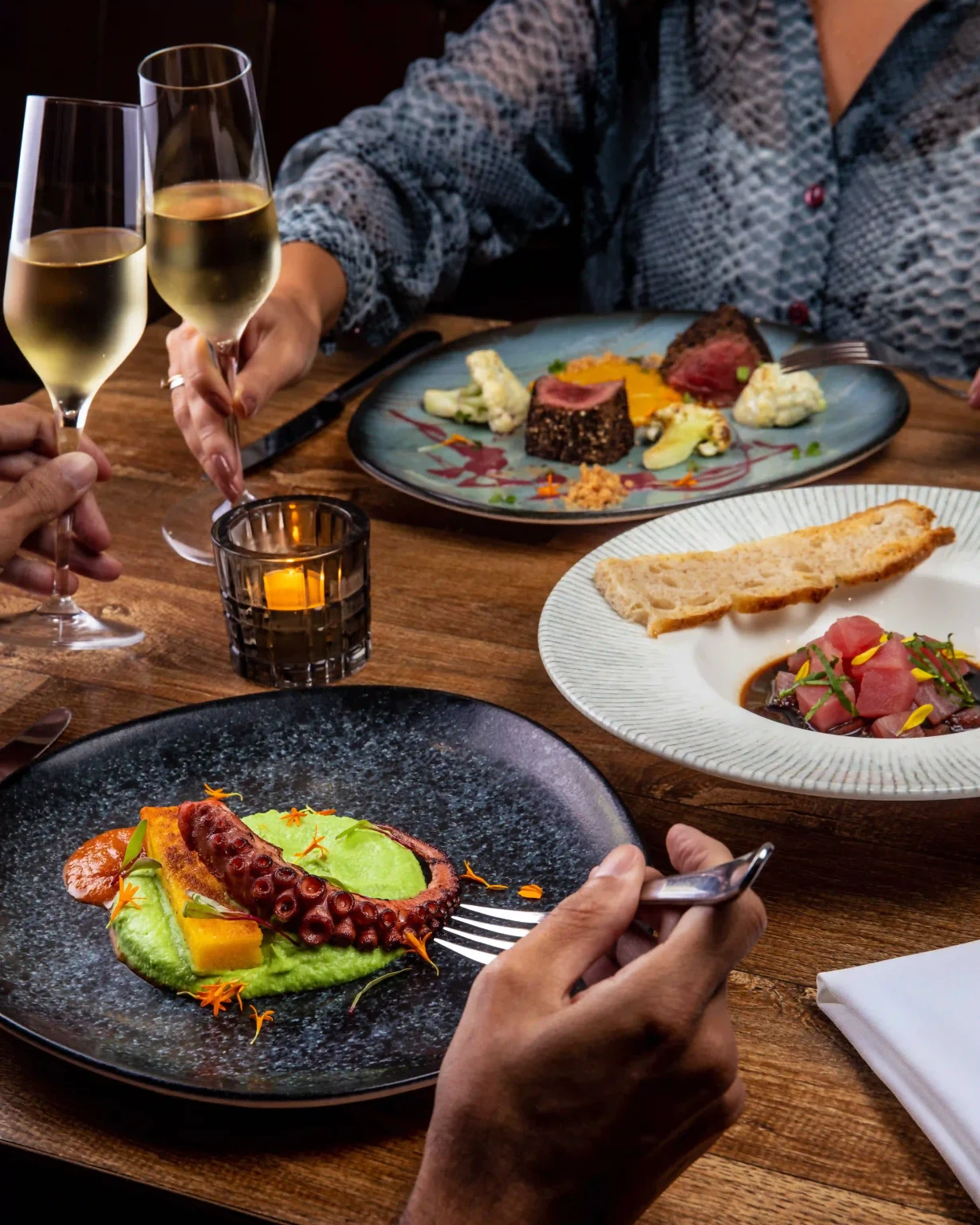O serviço se inicia com ceviche de atum fresco, couve mizuna crocante, shoyo e limão, acompanhado de focaccia de fermentação natural, produzida na casa. Na sequência, chega à mesa o queijo de cabra crottin com espaguete de palmito pupunha e molho de rapadura. O polvo confit com purê de ervilha, polenta italiana e putanesca abre o capítulo dos principais, sendo seguido pelo filé mignon rôti em crosta de sete pimentas e couve flor ao gorgonzola. O menu se encerra com frasier de framboesa e morangos e bombons. O jantar ainda inclui bebidas não alcoólicas e espumante (R$ 580 o casal) e é aberto a não hóspedes, mediante reserva antecipada. No dia 12, os casais também receberão um brinde especial do hotel.