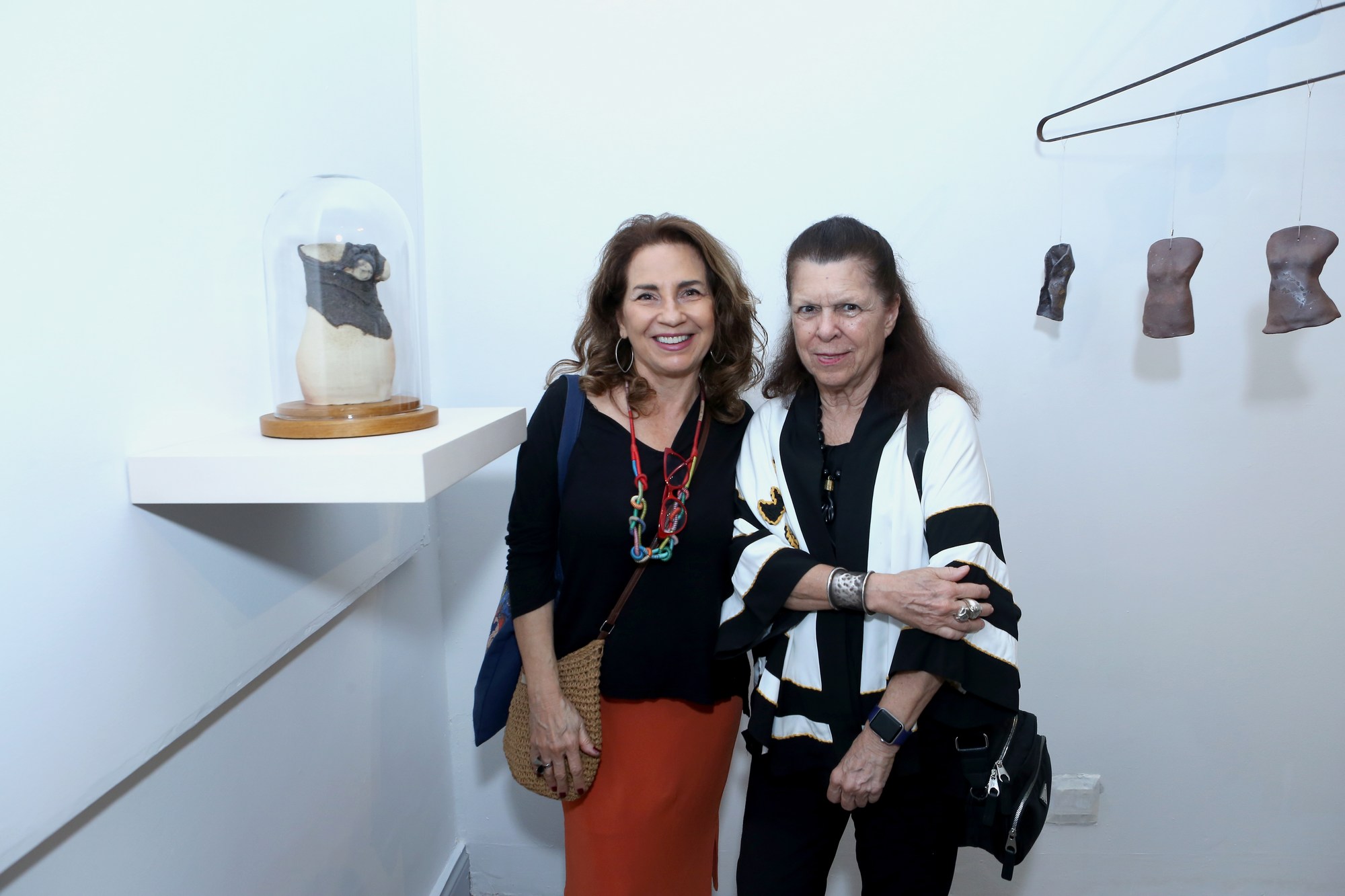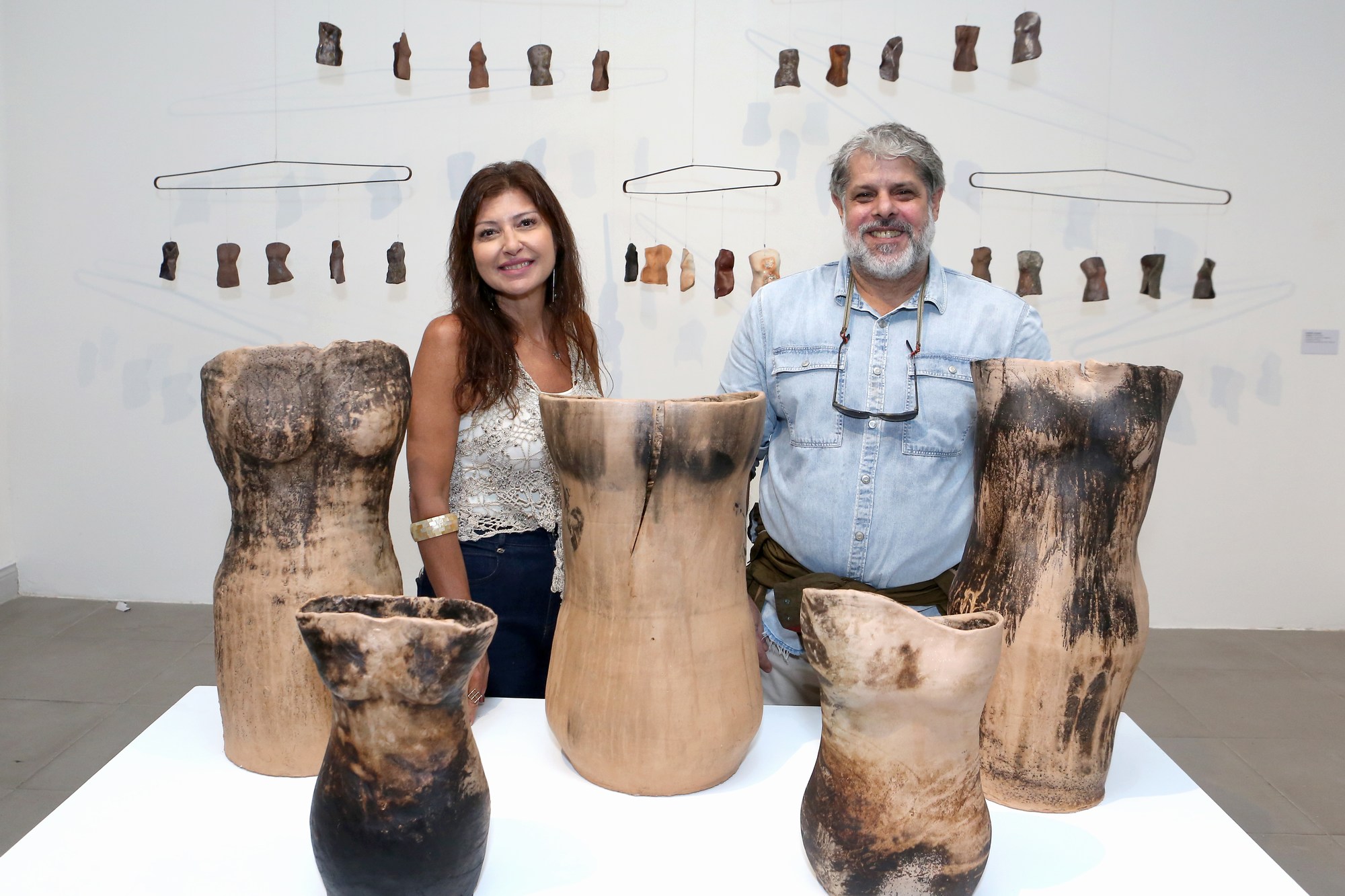 Por sua vez, Raquel Saliba apresenta um conjunto de corpos femininos que discutem a condição da mulher não apenas no contexto das violências físicas, mas também nas formas de negação da individualidade e da plenitude do ser produzidas por uma lógica patriarcal e por agressões simbólicas naturalizadas. Corpos acéfalos, reduzidos a troncos, instauram um discurso contundente sobre a experiência feminina no contemporâneo: a supressão da identidade como mecanismo de controle. Uma obra de caráter instalativo sintetiza a narrativa: cabides sustentam troncos femininos como se fossem mercadorias expostas, evocando a objetificação do corpo da mulher — transformado em produto, disponível ao consumo. Contudo, nesses corpos aparentemente destituídos de identidade reside uma força latente: se denunciam a redução e as violências, também afirmam autonomia, beleza e potência expressiva”, diz Sannon Botelho.