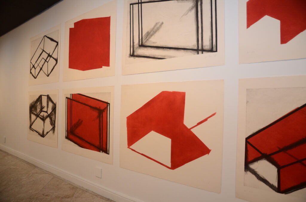 Seguindo o percurso, chega-se a uma sala menor, onde há uma escultura de parede com espelho e obras monocromáticas, compostas por séries azuis e vermelhas. “Quase não se pode ver o que está por baixo, são monocromias muito poderosas, mas vou trabalhando com lixas e revelando, gravura a gravura, o desenho que estava por baixo”, conta o artista. Na sala seguinte, haverá outra escultura de parede e duas séries de gravuras, uma composta por formas geométricas, inspiradas no construtivismo russo e no minimalismo americano, com cruzes e retângulos, e outra em tons azuis, que são estudos sobre uma mesma imagem, criando uma tensão entre a rigidez da estrutura e os limites laterais. A repetição de uma mesma imagem também estará na sala seguinte, no conjunto de gravuras de 2017 e 2018, onde haverá também uma escultura feita com uma grade de metal presa a dois espelhos na parede. Ao se aproximar, ao invés de uma chapa, o espectador verá um cubo, criado a partir do jogo entre os espelhos.