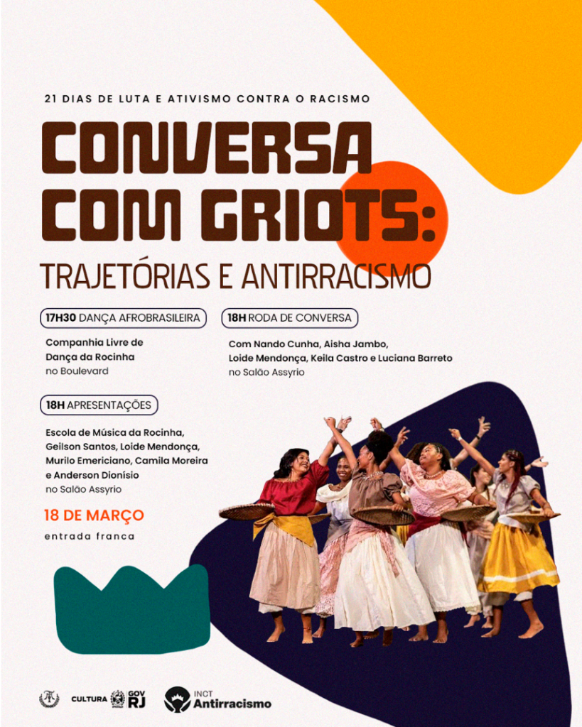 O Theatro Municipal do Rio de Janeiro recebe, no dia 18 de março, o evento “Conversas com Griots: trajetórias e antirracismo”, que integra a campanha 21 Dias de Ativismo e Luta contra o Racismo. A iniciativa reúne pesquisadores, artistas e representantes da sociedade civil para refletir sobre o combate ao racismo estrutural e a construção de uma sociedade mais justa e democrática.